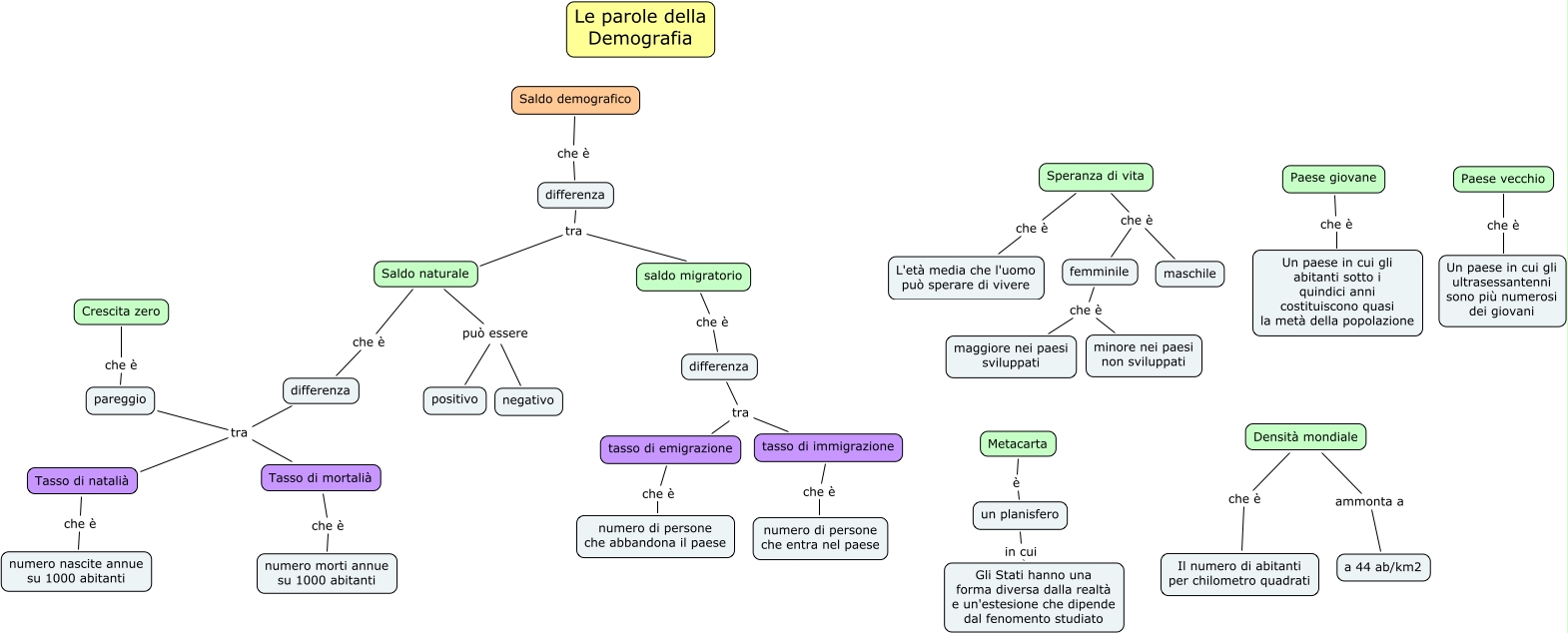 Questa Cmap, creata con IHMC CmapTools, contiene informazioni relative a: Le parole della demografia, Paese giovane che è Un paese in cui gli abitanti sotto i quindici anni costituiscono quasi la metà della popolazione, differenza tra saldo migratorio, Speranza di vita che è femminile, Densità mondiale che è Il numero di abitanti per chilometro quadrati, differenza tra Tasso di natalià, Metacarta è un planisfero, pareggio tra Tasso di natalià, Tasso di mortalià che è numero morti annue su 1000 abitanti, differenza tra Saldo naturale, Saldo naturale può essere negativo, Saldo naturale può essere positivo, Densità mondiale ammonta a a 44 ab/km2, differenza tra tasso di immigrazione, pareggio tra Tasso di mortalià, differenza tra tasso di emigrazione, Speranza di vita che è L'età media che l'uomo può sperare di vivere, tasso di immigrazione che è numero di persone che entra nel paese, differenza tra Tasso di mortalià, un planisfero in cui Gli Stati hanno una forma diversa dalla realtà e un'estesione che dipende dal fenomento studiato, tasso di emigrazione che è numero di persone che abbandona il paese
