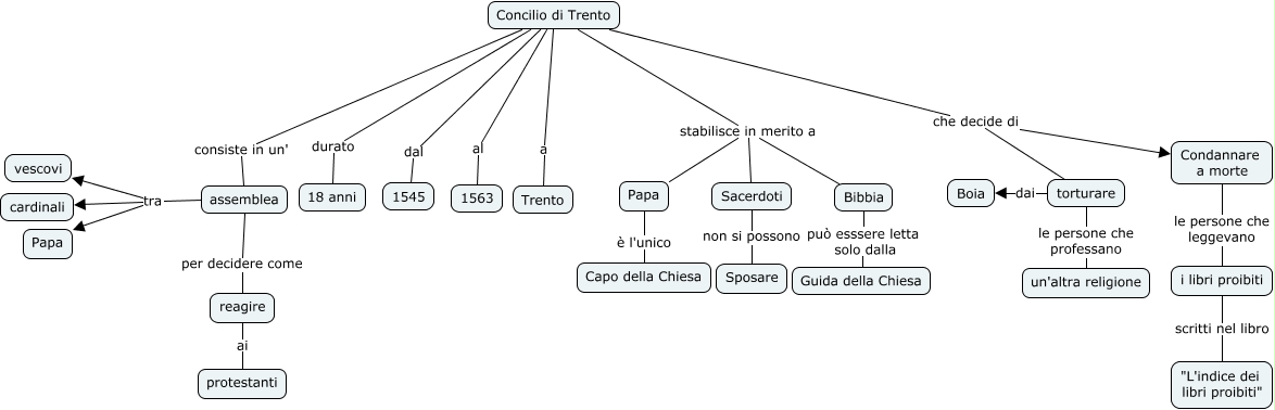 Questa Cmap, creata con IHMC CmapTools, contiene informazioni relative a: Concilio di Trento Eva Gnesotto 2A, assemblea tra vescovi, Concilio di Trento stabilisce in merito a Bibbia, Sacerdoti non si possono Sposare, Concilio di Trento al 1563, Condannare a morte le persone che leggevano i libri proibiti, Concilio di Trento stabilisce in merito a Sacerdoti, torturare dai Boia, Bibbia può esssere letta solo dalla Guida della Chiesa, assemblea tra cardinali, Papa è l'unico Capo della Chiesa, Concilio di Trento durato 18 anni, Concilio di Trento stabilisce in merito a Papa, Concilio di Trento che decide di Condannare a morte, assemblea per decidere come reagire, reagire ai protestanti, torturare le persone che professano un'altra religione, Concilio di Trento dal 1545, Concilio di Trento consiste in un' assemblea, assemblea tra Papa, Concilio di Trento a Trento