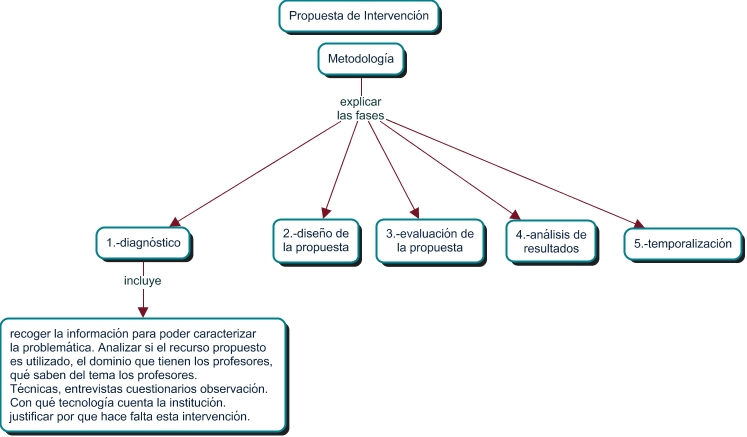Este Cmap, tiene información relacionada con: Fases PI-Metodologia, 1.-diagnóstico incluye recoger la información para poder caracterizar la problemática. Analizar si el recurso propuesto es utilizado, el dominio que tienen los profesores, qué saben del tema los profesores. Técnicas, entrevistas cuestionarios observación. Con qué tecnología cuenta la institución. justificar por que hace falta esta intervención., Metodología explicar las fases 1.-diagnóstico, Metodología explicar las fases 2.-diseño de la propuesta, Metodología explicar las fases 4.-análisis de resultados, Metodología explicar las fases 3.-evaluación de la propuesta, Metodología explicar las fases 5.-temporalización