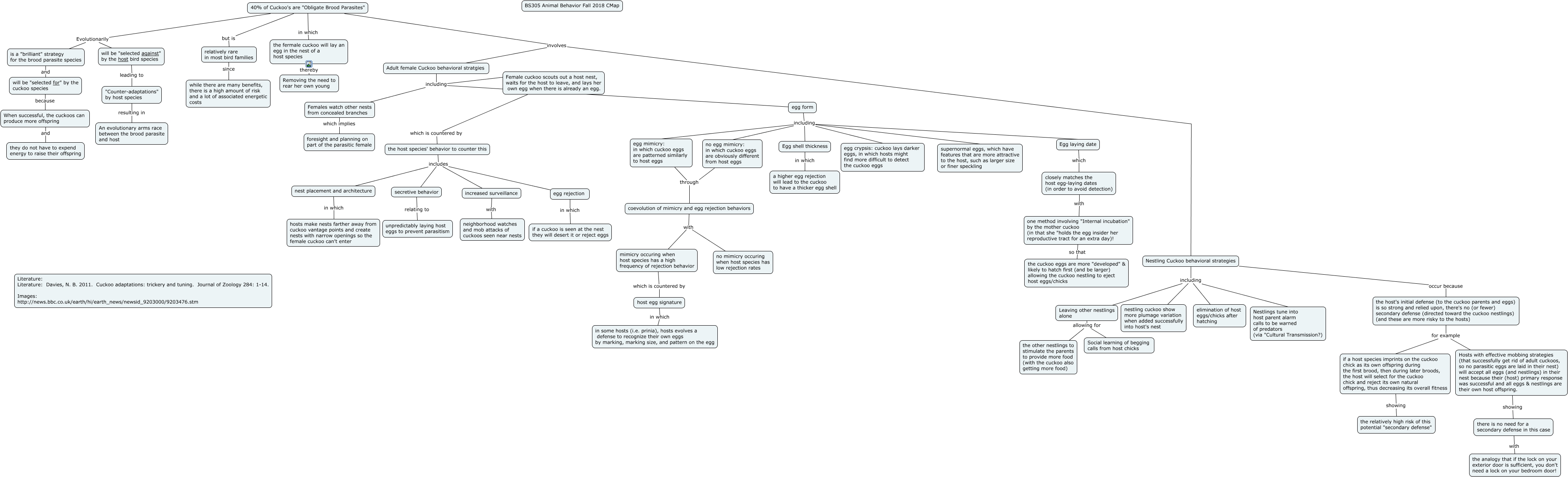 This Concept Map, created with IHMC CmapTools, has information related to: Davies 2011 Brood Parasites 111418, Leaving other nestlings alone allowing for the other nestlings to stimulate the parents to provide more food (with the cuckoo also getting more food), 40% of Cuckoo's are "Obligate Brood Parasites" Evolutionarily is a "brilliant" strategy for the brood parasite species, egg form including egg crypsis: cuckoo lays darker eggs, in which hosts might find more difficult to detect the cuckoo eggs, the fermale cuckoo will lay an egg in the nest of a host species thereby Removing the need to rear her own young, Nestling Cuckoo behavioral strategies including elimination of host eggs/chicks after hatching, Females watch other nests from concealed branches which implies foresight and planning on part of the parasitic female, there is no need for a secondary defense in this case with the analogy that if the lock on your exterior door is sufficient, you don't need a lock on your bedroom door!, Nestling Cuckoo behavioral strategies including Leaving other nestlings alone, will be "selected against" by the host bird species leading to "Counter-adaptations" by host species, nest placement and architecture in which hosts make nests farther away from cuckoo vantage points and create nests with narrow openings so the female cuckoo can't enter, Egg shell thickness in which a higher egg rejection will lead to the cuckoo to have a thicker egg shell, one method involving "Internal incubation" by the mother cuckoo (in that she "holds the egg insider her reproductive tract for an extra day)! so that the cuckoo eggs are more "developed" & likely to hatch first (and be larger) allowing the cuckoo nestling to eject host eggs/chicks, egg form including egg mimicry: in which cuckoo eggs are patterned similarly to host eggs, the host species' behavior to counter this includes increased surveillance, Hosts with effective mobbing strategies (that successfully get rid of adult cuckoos, so no parasitic eggs are laid in their nest) will accept all eggs (and nestlings) in their nest because their (host) primary response was successful and all eggs & nestlings are their own host offspring. showing there is no need for a secondary defense in this case, egg mimicry: in which cuckoo eggs are patterned similarly to host eggs through coevolution of mimicry and egg rejection behaviors, 40% of Cuckoo's are "Obligate Brood Parasites" Evolutionarily will be "selected against" by the host bird species, Nestling Cuckoo behavioral strategies including Nestlings tune into host parent alarm calls to be warned of predators (via "Cultural Transmission?), Adult female Cuckoo behavioral stratgies including egg form, "Counter-adaptations" by host species resulting in An evolutionary arms race between the brood parasite and host