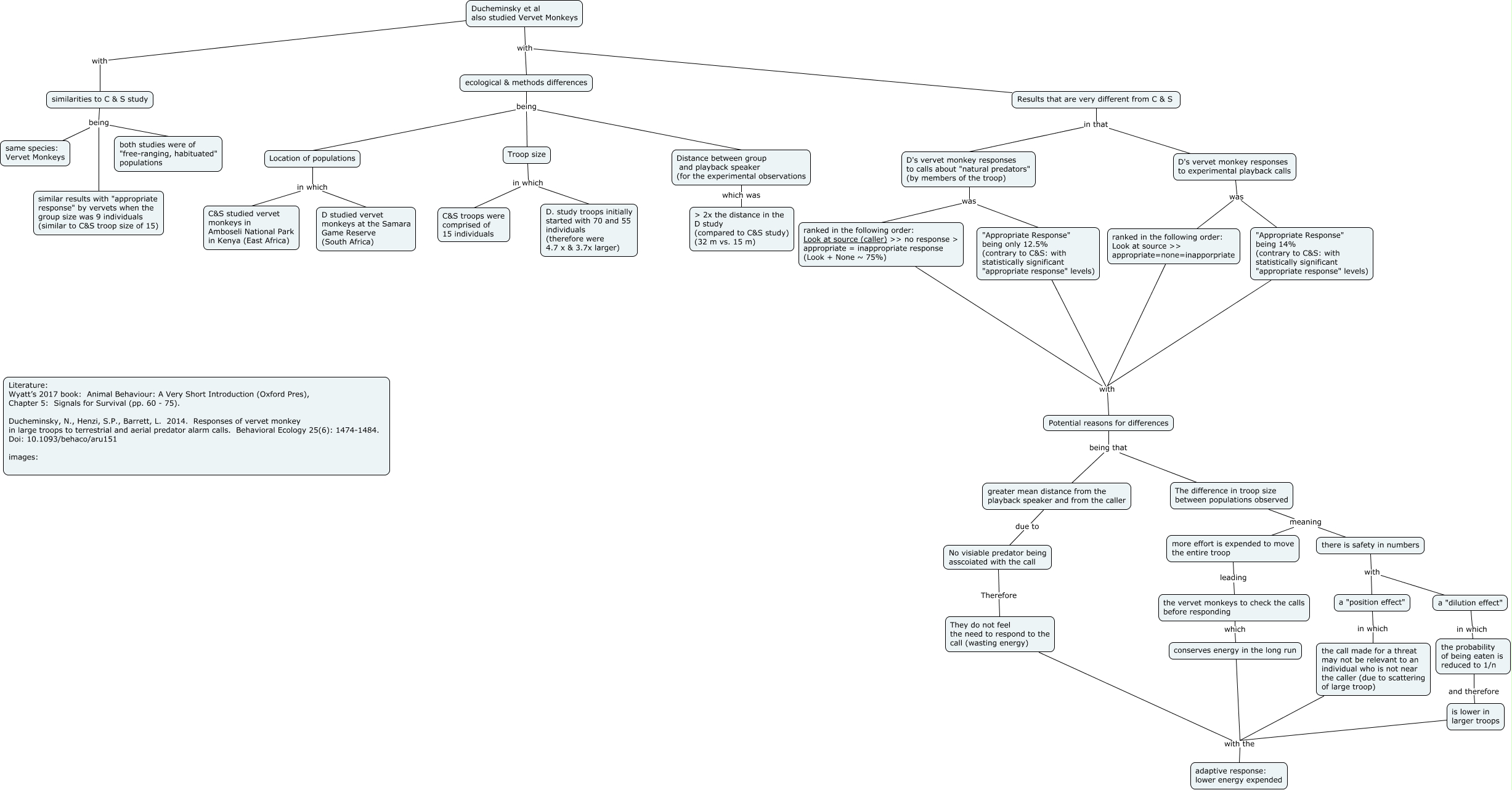 This Concept Map, created with IHMC CmapTools, has information related to: Ducheminsky et al 2014 110218 final, the probability of being eaten is reduced to 1/n and therefore is lower in larger troops, D's vervet monkey responses to calls about "natural predators" (by members of the troop) was "Appropriate Response" being only 12.5% (contrary to C&S: with statistically significant "appropriate response" levels), a "position effect" in which the call made for a threat may not be relevant to an individual who is not near the caller (due to scattering of large troop), similarities to C & S study being similar results with "appropriate response" by vervets when the group size was 9 individuals (similar to C&S troop size of 15), there is safety in numbers with a "dilution effect", Location of populations in which D studied vervet monkeys at the Samara Game Reserve (South Africa), Distance between group and playback speaker (for the experimental observations which was > 2x the distance in the D study (compared to C&S study) (32 m vs. 15 m), Troop size in which C&S troops were comprised of 15 individuals, "Appropriate Response" being 14% (contrary to C&S: with statistically significant "appropriate response" levels) with Potential reasons for differences, Ducheminsky et al also studied Vervet Monkeys with ecological & methods differences, the call made for a threat may not be relevant to an individual who is not near the caller (due to scattering of large troop) with the adaptive response: lower energy expended, is lower in larger troops with the adaptive response: lower energy expended, a "dilution effect" in which the probability of being eaten is reduced to 1/n, there is safety in numbers with a "position effect", ranked in the following order: Look at source (caller) >> no response > appropriate = inappropriate response (Look + None ~ 75%) with Potential reasons for differences, No visiable predator being asscoiated with the call Therefore They do not feel the need to respond to the call (wasting energy), greater mean distance from the playback speaker and from the caller due to No visiable predator being asscoiated with the call, ecological & methods differences being Distance between group and playback speaker (for the experimental observations, similarities to C & S study being same species: Vervet Monkeys, Potential reasons for differences being that greater mean distance from the playback speaker and from the caller