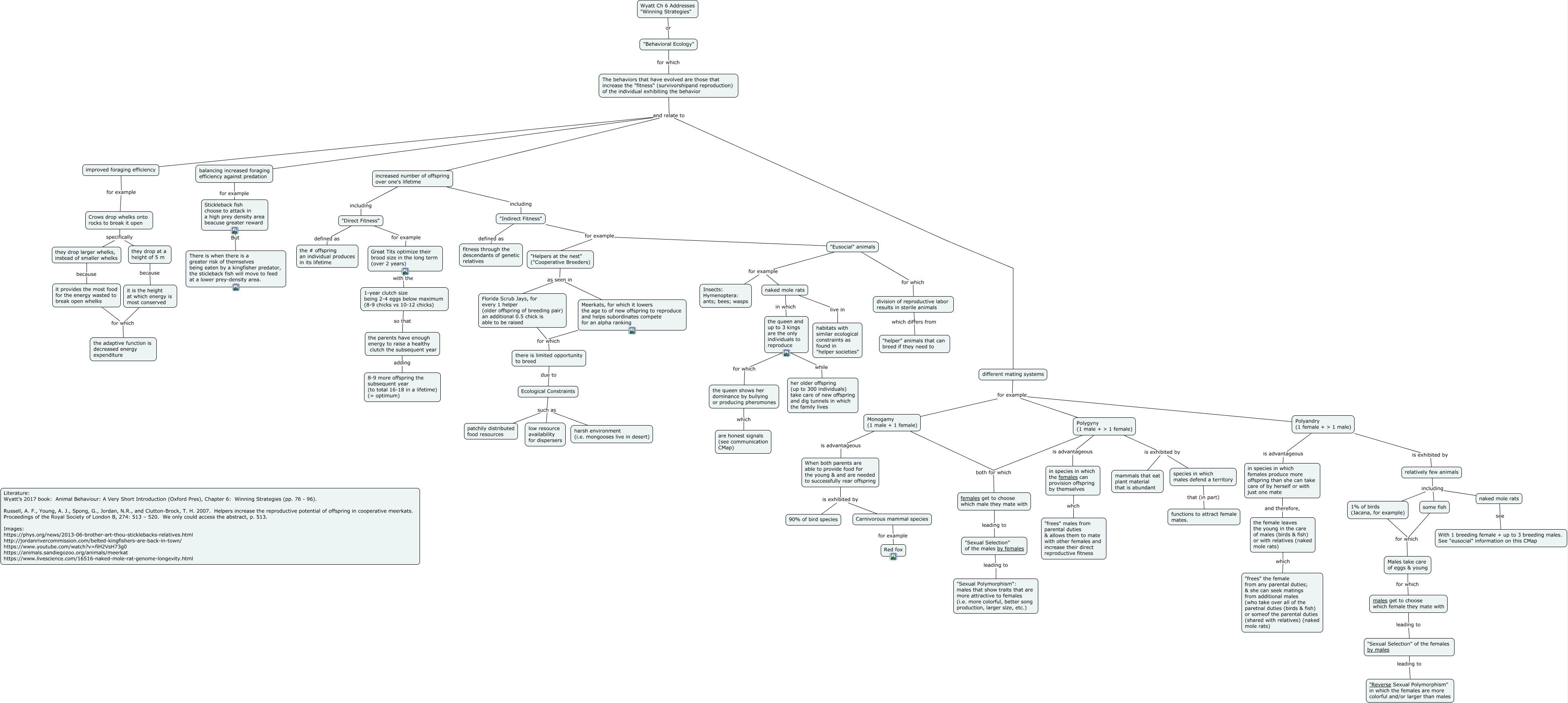 This Concept Map, created with IHMC CmapTools, has information related to: Wyatt Ch 6 Bhvl Ecology 111018, Carnivorous mammal species for example Red fox, in species in which the females can provision offspring by themselves whch "frees" males from parental duties & allows them to mate with other females and increase their direct reproductive fitness, The behaviors that have evolved are those that increase the "fitness" (survivorshipand reproduction) of the individual exhibiting the behavior and relate to improved foraging efficiency, different mating systems for example Monogamy (1 male + 1 female), "Direct Fitness" defined as the # offspring an individual produces in its lifetime, naked mole rats in which the queen and up to 3 kings are the only individuals to reproduce, the queen shows her dominance by bullying or producing pheromones which are honest signals (see communication CMap), naked mole rats live in habitats with similar ecological constraints as found in "helper societies", 1% of birds (Jacana, for example) for which Males take care of eggs & young, they drop larger whelks, instead of smaller whelks because it provides the most food for the energy wasted to break open whelks, some fish for which Males take care of eggs & young, the queen and up to 3 kings are the only individuals to reproduce for which the queen shows her dominance by bullying or producing pheromones, "Eusocial" animals for example Insects: Hymenoptera: ants; bees; wasps, Polyandry (1 female + > 1 male) is advantageous in species in which females produce more offspring than she can take care of by herself or with just one mate, "Indirect Fitness" defined as fitness through the descendants of genetic relatives, Polygyny (1 male + > 1 female) is advantageous in species in which the females can provision offspring by themselves, Great Tits optimize their brood size in the long term (over 2 years) with the 1-year clutch size being 2-4 eggs below maximum (8-9 chicks vs 10-12 chicks), "Indirect Fitness" for example "Helpers at the nest" ("Cooperative Breeders), division of reproductive labor results in sterile animals which differs from "helper" animals that can breed if they need to, relatively few animals including 1% of birds (Jacana, for example)