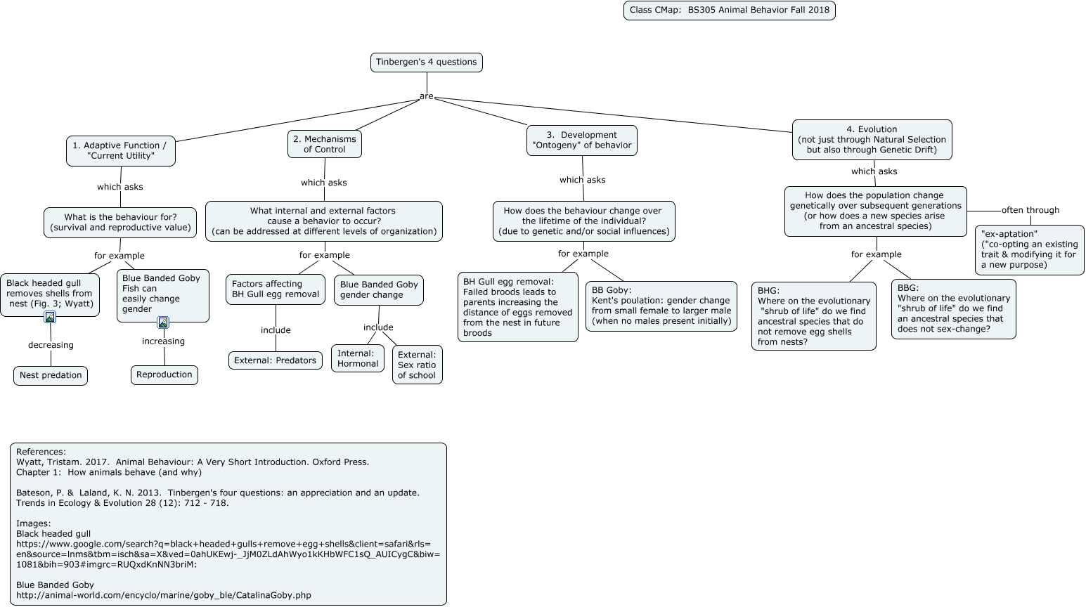 This Concept Map, created with IHMC CmapTools, has information related to: Tinbergen's 4 questions overview, Tinbergen's 4 questions are 2. Mechanisms of Control, Blue Banded Goby Fish can easily change gender increasing Reproduction, Factors affecting BH Gull egg removal include External: Predators, What internal and external factors cause a behavior to occur? (can be addressed at different levels of organization) for example Factors affecting BH Gull egg removal, How does the population change genetically over subsequent generations (or how does a new species arise from an ancestral species) for example BHG: Where on the evolutionary "shrub of life" do we find ancestral species that do not remove egg shells from nests?, How does the population change genetically over subsequent generations (or how does a new species arise from an ancestral species) for example BBG: Where on the evolutionary "shrub of life" do we find an ancestral species that does not sex-change?, What internal and external factors cause a behavior to occur? (can be addressed at different levels of organization) for example Blue Banded Goby gender change, 2. Mechanisms of Control which asks What internal and external factors cause a behavior to occur? (can be addressed at different levels of organization), How does the behaviour change over the lifetime of the individual? (due to genetic and/or social influences) for example BH Gull egg removal: Failed broods leads to parents increasing the distance of eggs removed from the nest in future broods, What is the behaviour for? (survival and reproductive value) for example Blue Banded Goby Fish can easily change gender, Tinbergen's 4 questions are 1. Adaptive Function / "Current Utility", How does the behaviour change over the lifetime of the individual? (due to genetic and/or social influences) for example BB Goby: Kent's poulation: gender change from small female to larger male (when no males present initially), Tinbergen's 4 questions are 4. Evolution (not just through Natural Selection but also through Genetic Drift), Black headed gull removes shells from nest (Fig. 3; Wyatt) decreasing Nest predation, How does the population change genetically over subsequent generations (or how does a new species arise from an ancestral species) often through "ex-aptation" ("co-opting an existing trait & modifying it for a new purpose), What is the behaviour for? (survival and reproductive value) for example Black headed gull removes shells from nest (Fig. 3; Wyatt), Blue Banded Goby gender change include External: Sex ratio of school, 4. Evolution (not just through Natural Selection but also through Genetic Drift) which asks How does the population change genetically over subsequent generations (or how does a new species arise from an ancestral species), Tinbergen's 4 questions are 3. Development "Ontogeny" of behavior, 1. Adaptive Function / "Current Utility" which asks What is the behaviour for? (survival and reproductive value)