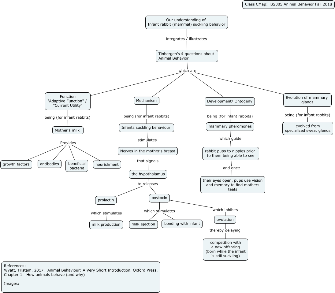 This Concept Map, created with IHMC CmapTools, has information related to: Infant rabbit suckling behavior, oxytocin which stimulates milk ejection, Tinbergen's 4 questions about Animal Behavior which are Evolution of mammary glands, prolactin which stimulates milk production, oxytocin which inhibits ovulation, Mother's milk Provides antibodies, Tinbergen's 4 questions about Animal Behavior which are Development/ Ontogeny, Tinbergen's 4 questions about Animal Behavior which are Mechanism, the hypothalamus to releases oxytocin, Mother's milk Provides beneficial bacteria, Function "Adaptive Function" / "Current Utility" being (for infant rabbits) Mother's milk, Development/ Ontogeny being (for infant rabbits) mammary pheromones, Mother's milk Provides nourishment, Our understanding of Infant rabbit (mammal) suckling behavior integrates / illustrates Tinbergen's 4 questions about Animal Behavior, Evolution of mammary glands being (for infant rabbits) evolved from specialized sweat glands, Mother's milk Provides growth factors, Tinbergen's 4 questions about Animal Behavior which are Function "Adaptive Function" / "Current Utility", Nerves in the mother's breast that signals the hypothalamus, oxytocin which stimulates bonding with infant, ovulation thereby delaying competition with a new offspring (born while the infant is still suckling), Mechanism being (for infant rabbits) Infants suckling behaviour