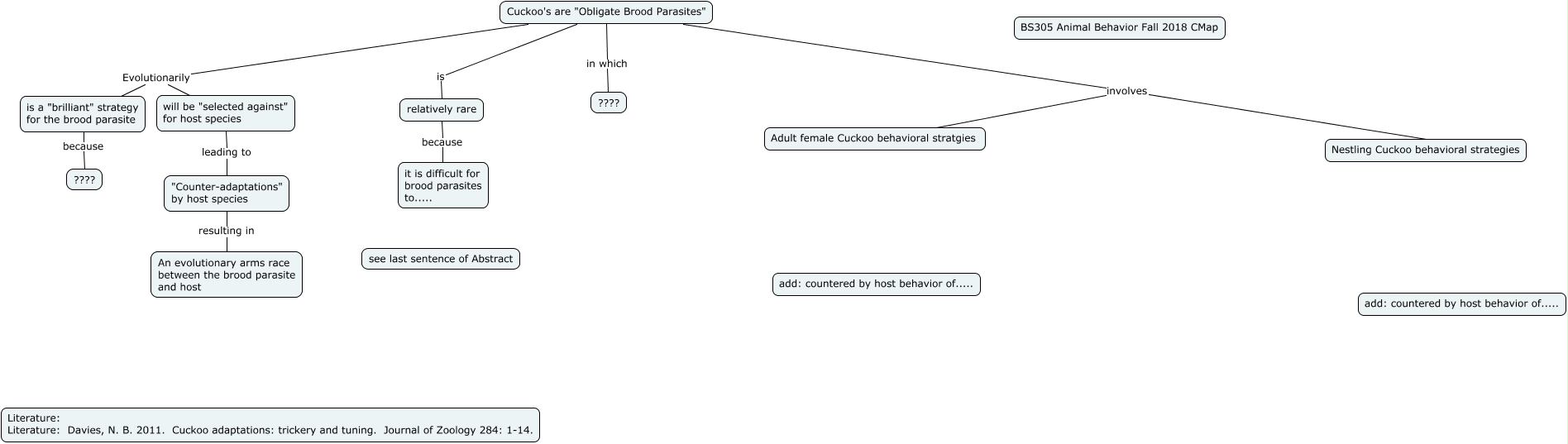 This Concept Map, created with IHMC CmapTools, has information related to: Davies 2011 Brood Parasites 111218, relatively rare because it is difficult for brood parasites to....., Cuckoo's are "Obligate Brood Parasites" is relatively rare, Cuckoo's are "Obligate Brood Parasites" Evolutionarily is a "brilliant" strategy for the brood parasite, Cuckoo's are "Obligate Brood Parasites" Evolutionarily will be "selected against" for host species, Cuckoo's are "Obligate Brood Parasites" in which ????, "Counter-adaptations" by host species resulting in An evolutionary arms race between the brood parasite and host, is a "brilliant" strategy for the brood parasite because ????, Cuckoo's are "Obligate Brood Parasites" involves Nestling Cuckoo behavioral strategies, Cuckoo's are "Obligate Brood Parasites" involves Adult female Cuckoo behavioral stratgies, will be "selected against" for host species leading to "Counter-adaptations" by host species