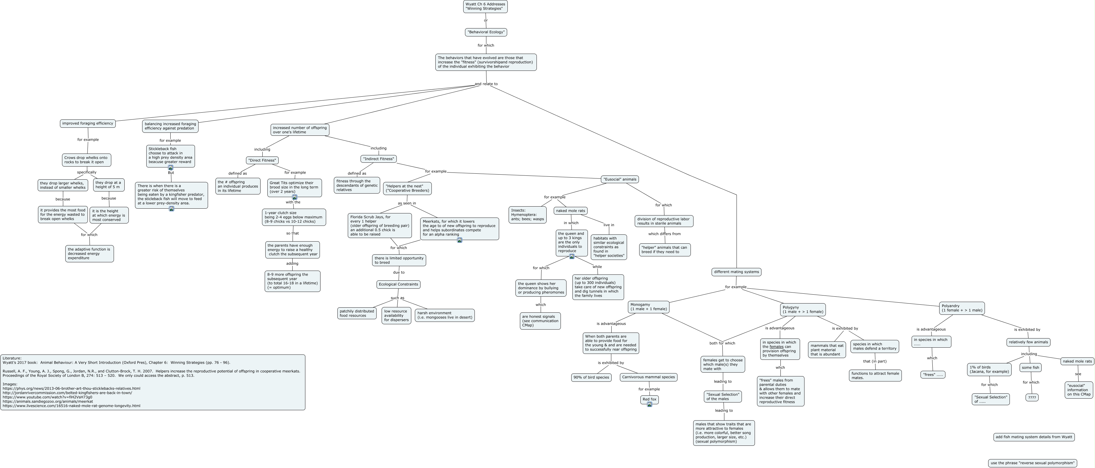 This Concept Map, created with IHMC CmapTools, has information related to: Wyatt Ch 6 Bhvl Ecology 110918, "Direct Fitness" for example Great Tits optimize their brood size in the long term (over 2 years), naked mole rats see "eusocial" information on this CMap, "Eusocial" animals for example naked mole rats, the queen and up to 3 kings are the only individuals to reproduce while her older offspring (up to 300 individuals) take care of new offspring and dig tunnels in which the family lives, there is limited opportunity to breed due to Ecological Constraints, When both parents are able to provide food for the young & and are needed to successfully rear offspring is exhibited by 90% of bird species, Carnivorous mammal species for example Red fox, Monogamy (1 male + 1 female) is advantageous When both parents are able to provide food for the young & and are needed to successfully rear offspring, Polyandry (1 female + > 1 male) is advantageous in species in which ....., "Behavioral Ecology" for which The behaviors that have evolved are those that increase the "fitness" (survivorshipand reproduction) of the individual exhibiting the behavior, in species in which the females can provision offspring by themselves whch "frees" males from parental duties & allows them to mate with other females and increase their direct reproductive fitness, "Indirect Fitness" for example "Helpers at the nest" ("Cooperative Breeders), different mating systems for example Monogamy (1 male + 1 female), different mating systems for example Polyandry (1 female + > 1 male), Wyatt Ch 6 Addresses "Winning Strategies" or "Behavioral Ecology", they drop larger whelks, instead of smaller whelks because it provides the most food for the energy wasted to break open whelks, The behaviors that have evolved are those that increase the "fitness" (survivorshipand reproduction) of the individual exhibiting the behavior and relate to increased number of offspring over one's lifetime, balancing increased foraging efficiency against predation for example Stickleback fish choose to attack in a high prey density area beacuse greater reward, increased number of offspring over one's lifetime including "Indirect Fitness", Great Tits optimize their brood size in the long term (over 2 years) with the 1-year clutch size being 2-4 eggs below maximum (8-9 chicks vs 10-12 chicks)