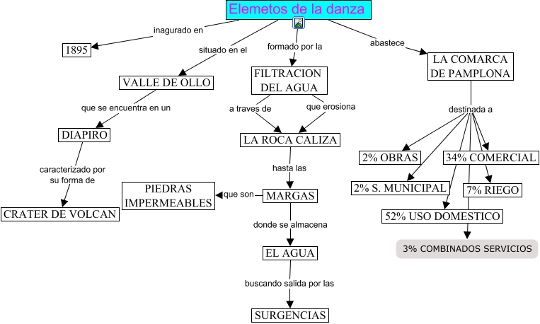 Este Cmap, tiene información relacionada con: DANZA, Elemetos de la danza inagurado en 1895, Elemetos de la danza abastece LA COMARCA DE PAMPLONA, VALLE DE OLLO que se encuentra en un DIAPIRO, EL AGUA buscando salida por las SURGENCIAS, LA COMARCA DE PAMPLONA destinada a 2% S. MUNICIPAL, LA COMARCA DE PAMPLONA destinada a 2% OBRAS, LA ROCA CALIZA hasta las MARGAS, LA COMARCA DE PAMPLONA destinada a 52% USO DOMESTICO, FILTRACION DEL AGUA que erosiona LA ROCA CALIZA, MARGAS donde se almacena EL AGUA, Elemetos de la danza formado por la FILTRACION DEL AGUA, DIAPIRO caracterizado por su forma de CRATER DE VOLCAN, MARGAS que son PIEDRAS IMPERMEABLES, Elemetos de la danza situado en el VALLE DE OLLO, LA COMARCA DE PAMPLONA destinada a 34% COMERCIAL, FILTRACION DEL AGUA a traves de LA ROCA CALIZA, LA COMARCA DE PAMPLONA destinada a 7% RIEGO, LA COMARCA DE PAMPLONA destinada a 3% COMBINADOS SERVICIOS