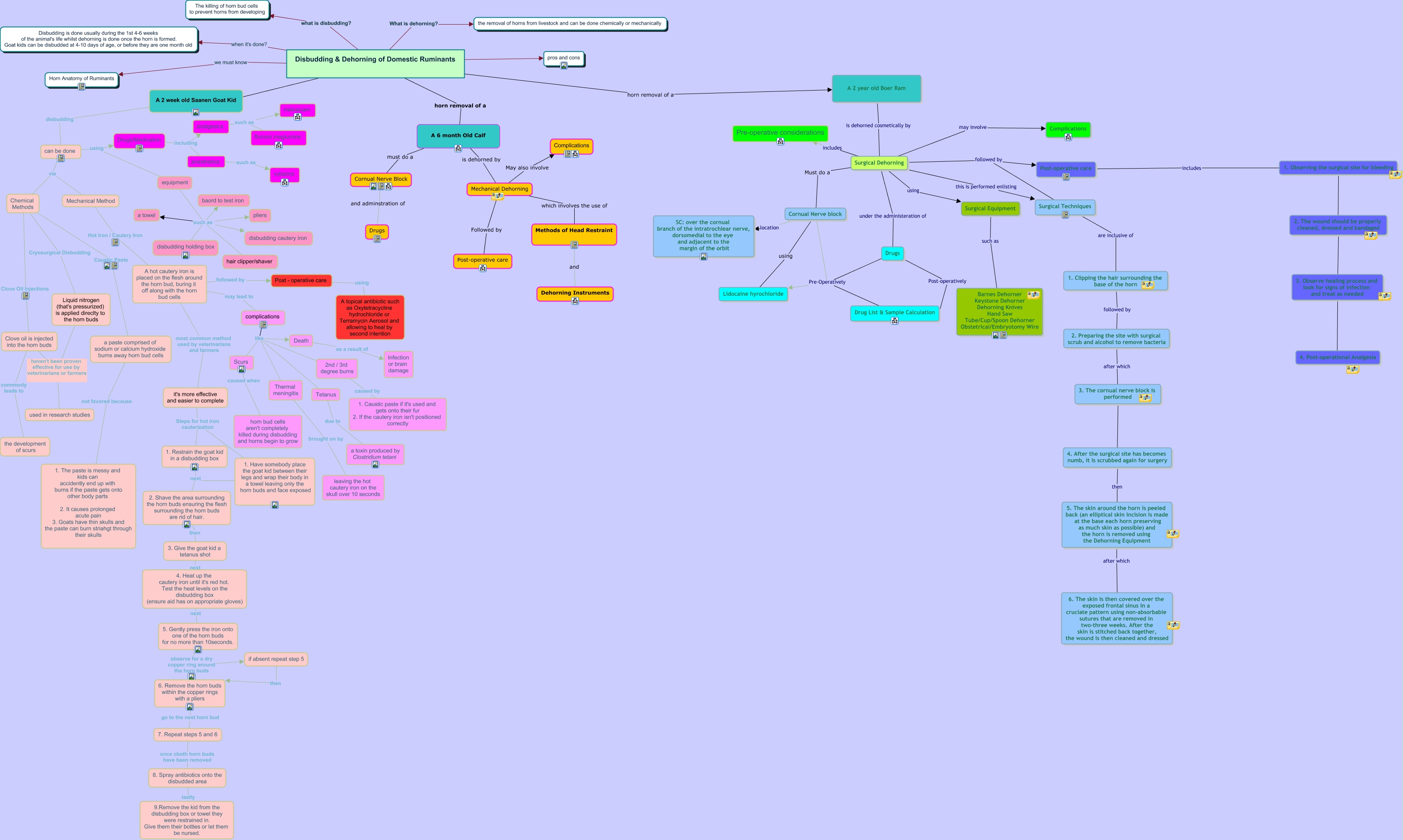 This Concept Map, created with IHMC CmapTools, has information related to: Disbudding and Dehorning, Surgical Techniques followed by Post-operative care, Cornual Nerve block using Lidocaine hyrochloride, A 2 year old Boer Ram is dehorned cosmetically by Surgical Dehorning, Tetanus due to a toxin produced by Clostridium tetani, Death as a result of Infection or brain damage, Surgical Dehorning Must do a Cornual Nerve block, Disbudding & Dehorning of Domestic Ruminants What is dehorning? the removal of horns from livestock and can be done chemically or mechanically, complications like 2nd / 3rd degree burns, equipment such as baord to test iron, can be done using equipment, can be done via Mechanical Method, A 6 month Old Calf must do a Cornual Nerve Block, A hot cautery iron is placed on the flesh around the horn bud, buring it off along with the horn bud cells most common method used by veterinarians and farmers it's more effective and easier to complete, complications like Scurs, complications like Thermal meningitis, Methods of Head Restraint and Dehorning Instruments, equipment such as a towel, 2. Preparing the site with surgical scrub and alcohol to remove bacteria after which 3. The cornual nerve block is performed, Chemical Methods Caustic Paste a paste comprised of sodium or calcium hydroxide burns away horn bud cells, Disbudding & Dehorning of Domestic Ruminants horn removal of a A 2 year old Boer Ram