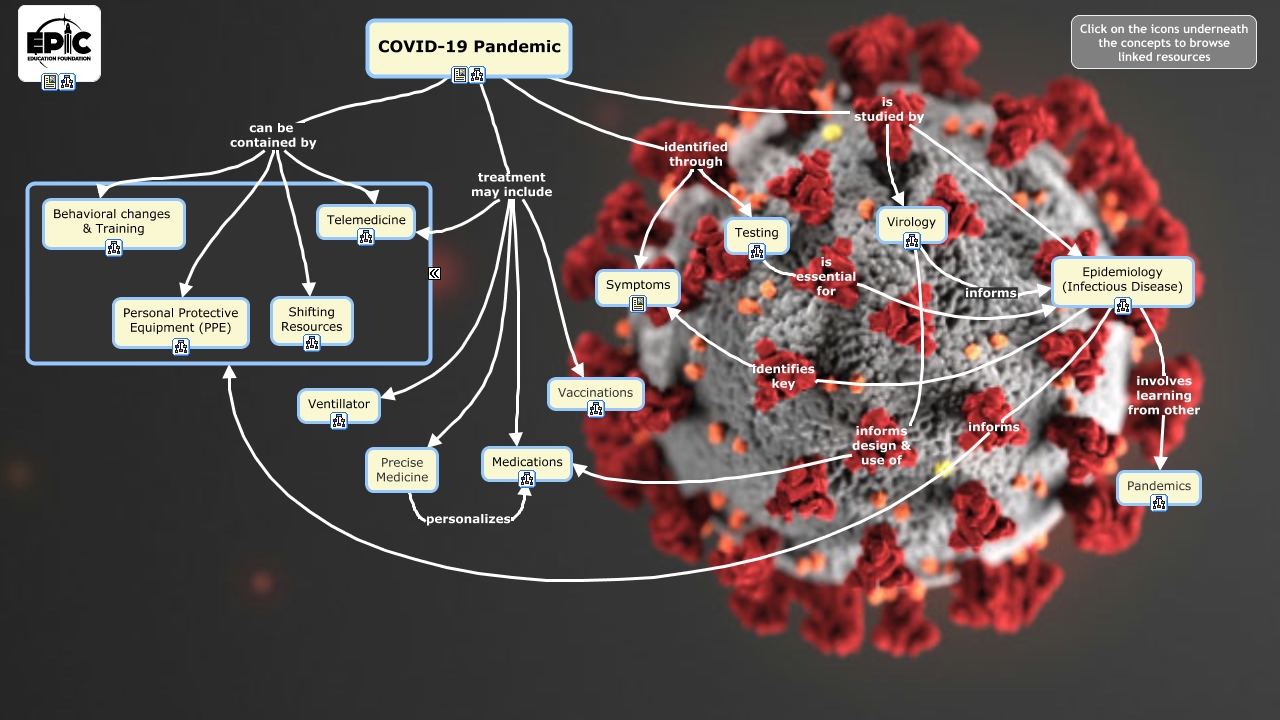 This Concept Map, created with IHMC CmapTools, has information related to: COVID-19 Pandemic - Home Cmap, COVID-19 Pandemic treatment may include Ventillator, Virology informs design & use of Medications, COVID-19 Pandemic is studied by Epidemiology (Infectious Disease), COVID-19 Pandemic treatment may include Vaccinations, COVID-19 Pandemic treatment may include Medications, COVID-19 Pandemic can be contained by Personal Protective Equipment (PPE), Virology informs Epidemiology (Infectious Disease), Precise Medicine personalizes Medications, Testing is essential for Epidemiology (Infectious Disease), Epidemiology (Infectious Disease) informs Various Methods, COVID-19 Pandemic is studied by Virology, COVID-19 Pandemic treatment may include Telemedicine, COVID-19 Pandemic identified through Testing, COVID-19 Pandemic treatment may include Precise Medicine, COVID-19 Pandemic can be contained by Shifting Resources, Epidemiology (Infectious Disease) involves learning from other Pandemics, COVID-19 Pandemic identified through Symptoms, Epidemiology (Infectious Disease) identifies key Symptoms, COVID-19 Pandemic can be contained by Behavioral changes & Training, COVID-19 Pandemic can be contained by Telemedicine