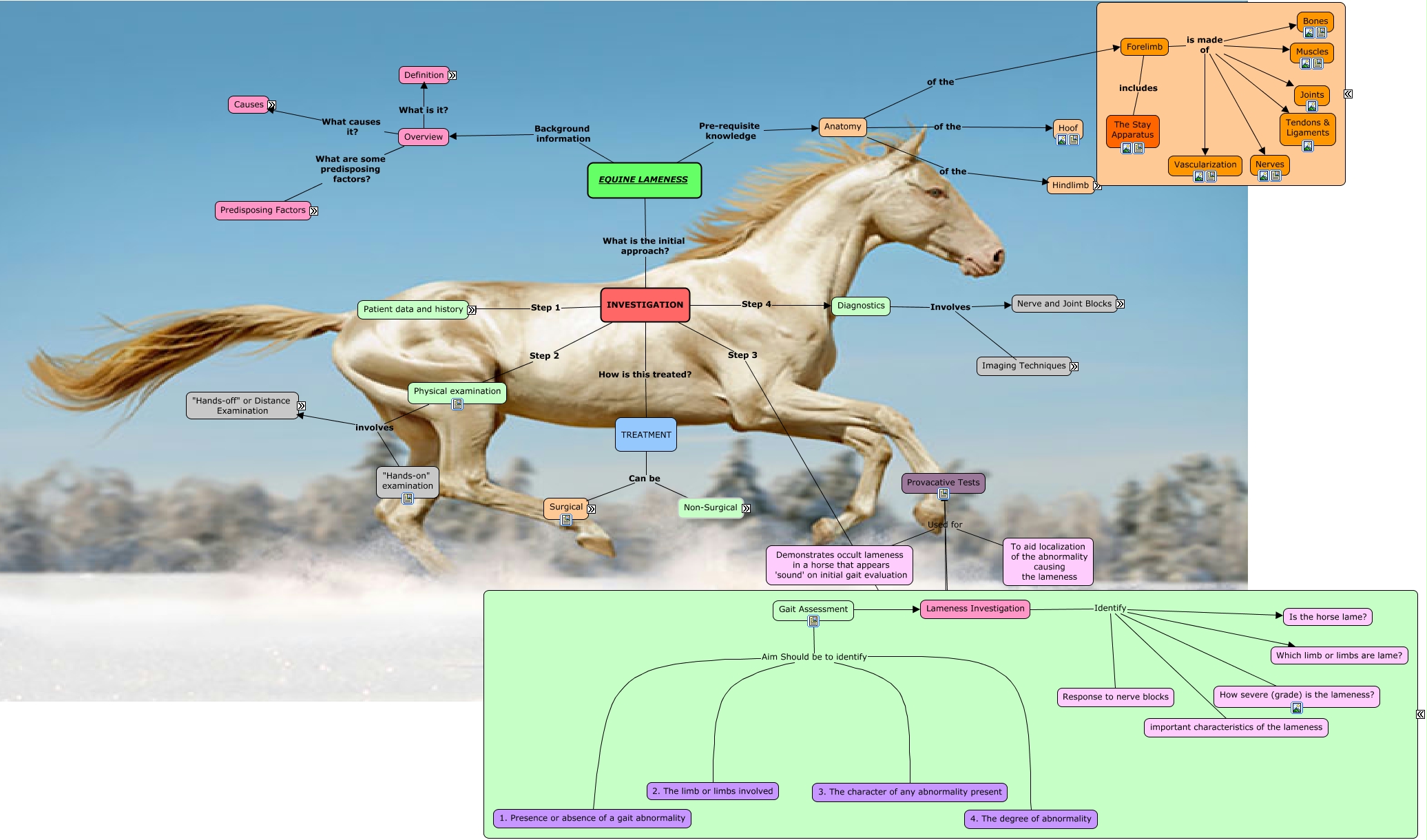 This Concept Map, created with IHMC CmapTools, has information related to: Equine Lameness Investigation, Cause of Lameness may be due to Pentrating wounds, Nerve Block Contraindications, Gait Assessment Lameness Investigation, Hindlimb is made of Bones, Forelimb is made of Joints, 2. Details on recent management Exercise, INVESTIGATION Step 1 Patient data and history, Non-Surgical Subsolar Abscess (Scroll Over), Imaging Includes MRI, Joint Block Types Coffin, 2. Details on recent management Shoeing, Surgical Treatment Depends on Use of the horse, Joint Block Types Tarsometatarsal, Forelimb is made of Muscles, INVESTIGATION Step 2 Physical examination, Forelimb is made of Vascularization, TREATMENT Can be Non-Surgical, Hindlimb is made of Muscles, Overview What is it? Definition, 3. Previous Locomotor problems known to the owner should be noted Respone to therapy