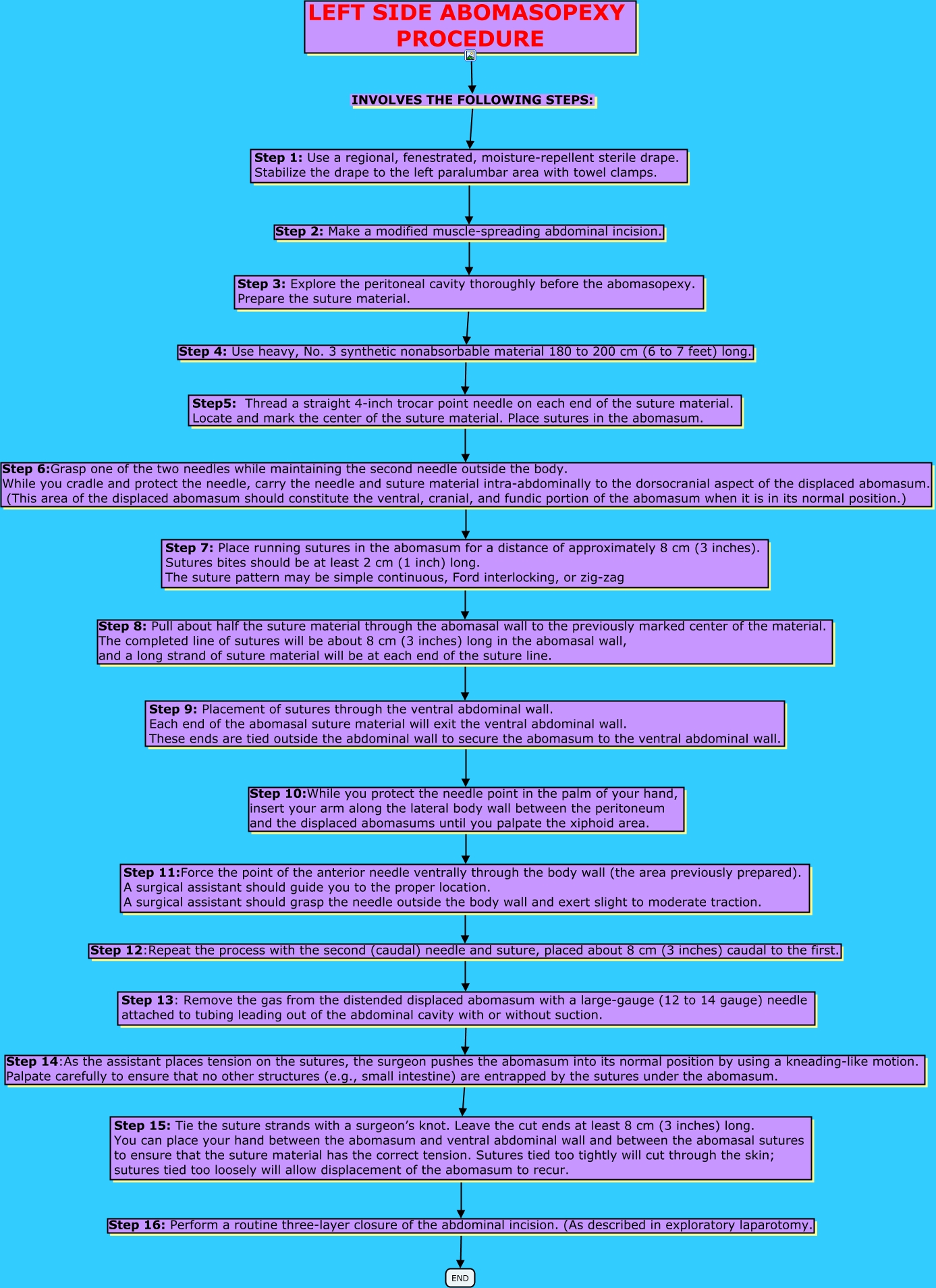 This Concept Map, created with IHMC CmapTools, has information related to: Left Side Abomasopexy Procedure, Step 15: Tie the suture strands with a surgeon’s knot. Leave the cut ends at least 8 cm (3 inches) long. You can place your hand between the abomasum and ventral abdominal wall and between the abomasal sutures to ensure that the suture material has the correct tension. Sutures tied too tightly will cut through the skin; sutures tied too loosely will allow displacement of the abomasum to recur. Step 16: Perform a routine three-layer closure of the abdominal incision. (As described in exploratory laparotomy. END, Step 3: Explore the peritoneal cavity thoroughly before the abomasopexy. Prepare the suture material. Step 4: Use heavy, No. 3 synthetic nonabsorbable material 180 to 200 cm (6 to 7 feet) long. Step5: Thread a straight 4-inch trocar point needle on each end of the suture material. Locate and mark the center of the suture material. Place sutures in the abomasum., Step 13: Remove the gas from the distended displaced abomasum with a large-gauge (12 to 14 gauge) needle attached to tubing leading out of the abdominal cavity with or without suction. Step 14:As the assistant places tension on the sutures, the surgeon pushes the abomasum into its normal position by using a kneading-like motion. Palpate carefully to ensure that no other structures (e.g., small intestine) are entrapped by the sutures under the abomasum. Step 15: Tie the suture strands with a surgeon’s knot. Leave the cut ends at least 8 cm (3 inches) long. You can place your hand between the abomasum and ventral abdominal wall and between the abomasal sutures to ensure that the suture material has the correct tension. Sutures tied too tightly will cut through the skin; sutures tied too loosely will allow displacement of the abomasum to recur., LEFT SIDE ABOMASOPEXY PROCEDURE INVOLVES THE FOLLOWING STEPS: Step 1: Use a regional, fenestrated, moisture-repellent sterile drape. Stabilize the drape to the left paralumbar area with towel clamps., Step 1: Use a regional, fenestrated, moisture-repellent sterile drape. Stabilize the drape to the left paralumbar area with towel clamps. Step 2: Make a modified muscle-spreading abdominal incision. Step 3: Explore the peritoneal cavity thoroughly before the abomasopexy. Prepare the suture material., Step 9: Placement of sutures through the ventral abdominal wall. Each end of the abomasal suture material will exit the ventral abdominal wall. These ends are tied outside the abdominal wall to secure the abomasum to the ventral abdominal wall. Step 10:While you protect the needle point in the palm of your hand, insert your arm along the lateral body wall between the peritoneum and the displaced abomasums until you palpate the xiphoid area. Step 11:Force the point of the anterior needle ventrally through the body wall (the area previously prepared). A surgical assistant should guide you to the proper location. A surgical assistant should grasp the needle outside the body wall and exert slight to moderate traction., Step 11:Force the point of the anterior needle ventrally through the body wall (the area previously prepared). A surgical assistant should guide you to the proper location. A surgical assistant should grasp the needle outside the body wall and exert slight to moderate traction. Step 12:Repeat the process with the second (caudal) needle and suture, placed about 8 cm (3 inches) caudal to the first. Step 13: Remove the gas from the distended displaced abomasum with a large-gauge (12 to 14 gauge) needle attached to tubing leading out of the abdominal cavity with or without suction., Step 7: Place running sutures in the abomasum for a distance of approximately 8 cm (3 inches). Sutures bites should be at least 2 cm (1 inch) long. The suture pattern may be simple continuous, Ford interlocking, or zig-zag Step 8: Pull about half the suture material through the abomasal wall to the previously marked center of the material. The completed line of sutures will be about 8 cm (3 inches) long in the abomasal wall, and a long strand of suture material will be at each end of the suture line. Step 9: Placement of sutures through the ventral abdominal wall. Each end of the abomasal suture material will exit the ventral abdominal wall. These ends are tied outside the abdominal wall to secure the abomasum to the ventral abdominal wall., Step5: Thread a straight 4-inch trocar point needle on each end of the suture material. Locate and mark the center of the suture material. Place sutures in the abomasum. Step 6:Grasp one of the two needles while maintaining the second needle outside the body. While you cradle and protect the needle, carry the needle and suture material intra-abdominally to the dorsocranial aspect of the displaced abomasum. (This area of the displaced abomasum should constitute the ventral, cranial, and fundic portion of the abomasum when it is in its normal position.) Step 7: Place running sutures in the abomasum for a distance of approximately 8 cm (3 inches). Sutures bites should be at least 2 cm (1 inch) long. The suture pattern may be simple continuous, Ford interlocking, or zig-zag