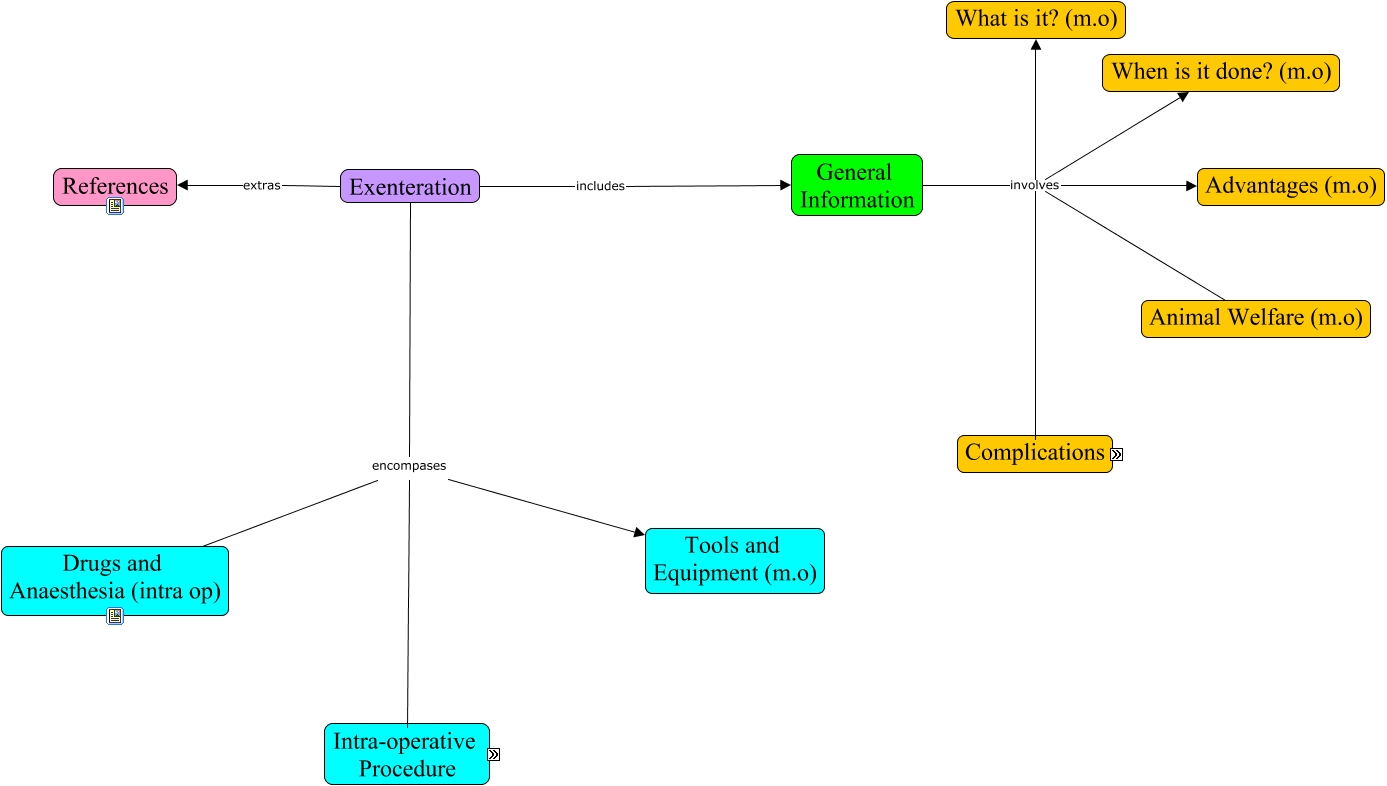This Concept Map, created with IHMC CmapTools, has information related to: Exenteration, Exenteration encompases Drugs and Anaesthesia (intra op), General Information involves Advantages (m.o), Step 1 (m.o) followed by Step 2 (m.o), Complications includes Contamination (m.o), Complications includes Infection (m.o), General Information involves When is it done? (m.o), Exenteration encompases Intra-Operative Procedure, Step 3 (m.o) finally Step 4 (m.o), Complications includes Incomplete Closure (m.o), Exenteration extras References, General Information involves What is it? (m.o), General Information involves Animal Welfare (m.o), Intra-Operative Procedure includes Step 1 (m.o), Step 2 (m.o) then Step 3 (m.o), General Information involves Complications, Exenteration encompases Tools and Equipment (m.o), Exenteration includes General Information