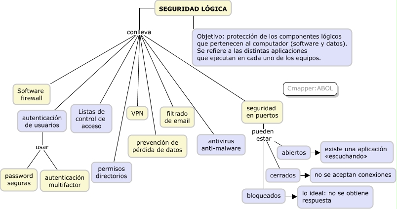 Este Cmap, tiene información relacionada con: Seguridad Logica, SEGURIDAD LÓGICA Objetivo: protección de los componentes lógicos que pertenecen al computador (software y datos). Se refiere a las distintas aplicaciones que ejecutan en cada uno de los equipos., SEGURIDAD LÓGICA conlleva seguridad en puertos, seguridad en puertos pueden estar cerrados, SEGURIDAD LÓGICA conlleva permisos directorios, SEGURIDAD LÓGICA conlleva prevención de pérdida de datos, seguridad en puertos pueden estar bloqueados, autenticación de usuarios usar password seguras, SEGURIDAD LÓGICA conlleva autenticación de usuarios, SEGURIDAD LÓGICA conlleva filtrado de email, autenticación de usuarios usar autenticación multifactor, bloqueados lo ideal: no se obtiene respuesta, SEGURIDAD LÓGICA conlleva antivirus anti-malware, SEGURIDAD LÓGICA conlleva VPN, SEGURIDAD LÓGICA conlleva Listas de control de acceso, cerrados no se aceptan conexiones, SEGURIDAD LÓGICA conlleva Software firewall, seguridad en puertos pueden estar abiertos, abiertos existe una aplicación «escuchando»