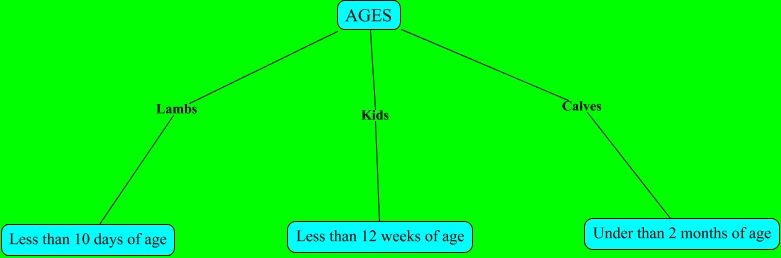 This Concept Map, created with IHMC CmapTools, has information related to: Short Scrotum Method Age, AGES Kids Less than 12 weeks of age, AGES Lambs Less than 10 days of age, AGES Calves Under than 2 months of age