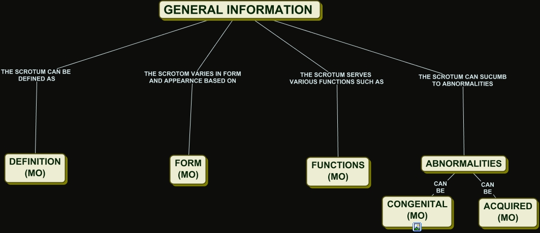 This Concept Map, created with IHMC CmapTools, has information related to: SCROTUM GENERAL INFORMATION, GENERAL INFORMATION THE SCROTOM VARIES IN FORM AND APPEARNCE BASED ON FORM (MO), GENERAL INFORMATION THE SCROTUM CAN SUCUMB TO ABNORMALITIES ABNORMALITIES, ABNORMALITIES CAN BE CONGENITAL (MO), GENERAL INFORMATION THE SCROTUM SERVES VARIOUS FUNCTIONS SUCH AS FUNCTIONS (MO), ABNORMALITIES CAN BE ACQUIRED (MO), GENERAL INFORMATION THE SCROTUM CAN BE DEFINED AS DEFINITION (MO)