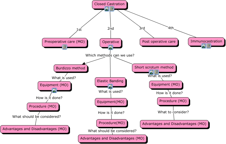 This Concept Map, created with IHMC CmapTools, has information related to: Untitled 3, Procedure (MO) What should be considered? Advantages and Disadvantages (MO), Closed Castration 4th Immunocastration, Closed Castration 2nd Operative, Closed Castration 1st Preoperative care (MO), Equipment (MO) How is it done? Procedure (MO), Operative Which methods can we use? Short scrotum method, Closed Castration 3rd Post operative care, Operative Which methods can we use? Elastic Banding, Operative Which methods can we use? Burdizzo method, Elastic Banding What is used? Equipment(MO), Procedure(MO) What should be considered? Advantages and Disadvantages (MO), Burdizzo method What is used? Equipment (MO), Short scrotum method What is used? Equipment (MO), Equipment (MO) How is it done? Procedure (MO), Equipment(MO) How is it done? Procedure(MO), Procedure (MO) What to consider? Advantages and Disadvantages (MO)