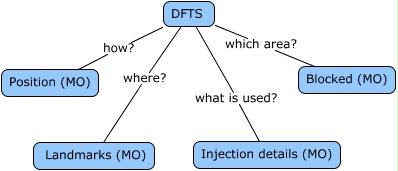 This Concept Map, created with IHMC CmapTools, has information related to: Mini DFTS Procedure, DFTS where? Landmarks (MO), DFTS what is used? Injection details (MO), DFTS how? Position (MO), DFTS which area? Blocked (MO)