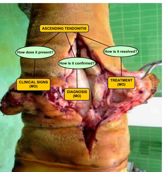 This Concept Map, created with IHMC CmapTools, has information related to: Ascending Tendonitis, ASCENDING TENDONITIS How is it resolved? TREATMENT (MO), ASCENDING TENDONITIS How does it present? CLINICAL SIGNS (MO), ASCENDING TENDONITIS How is it confirmed? DIAGNOSIS (MO)