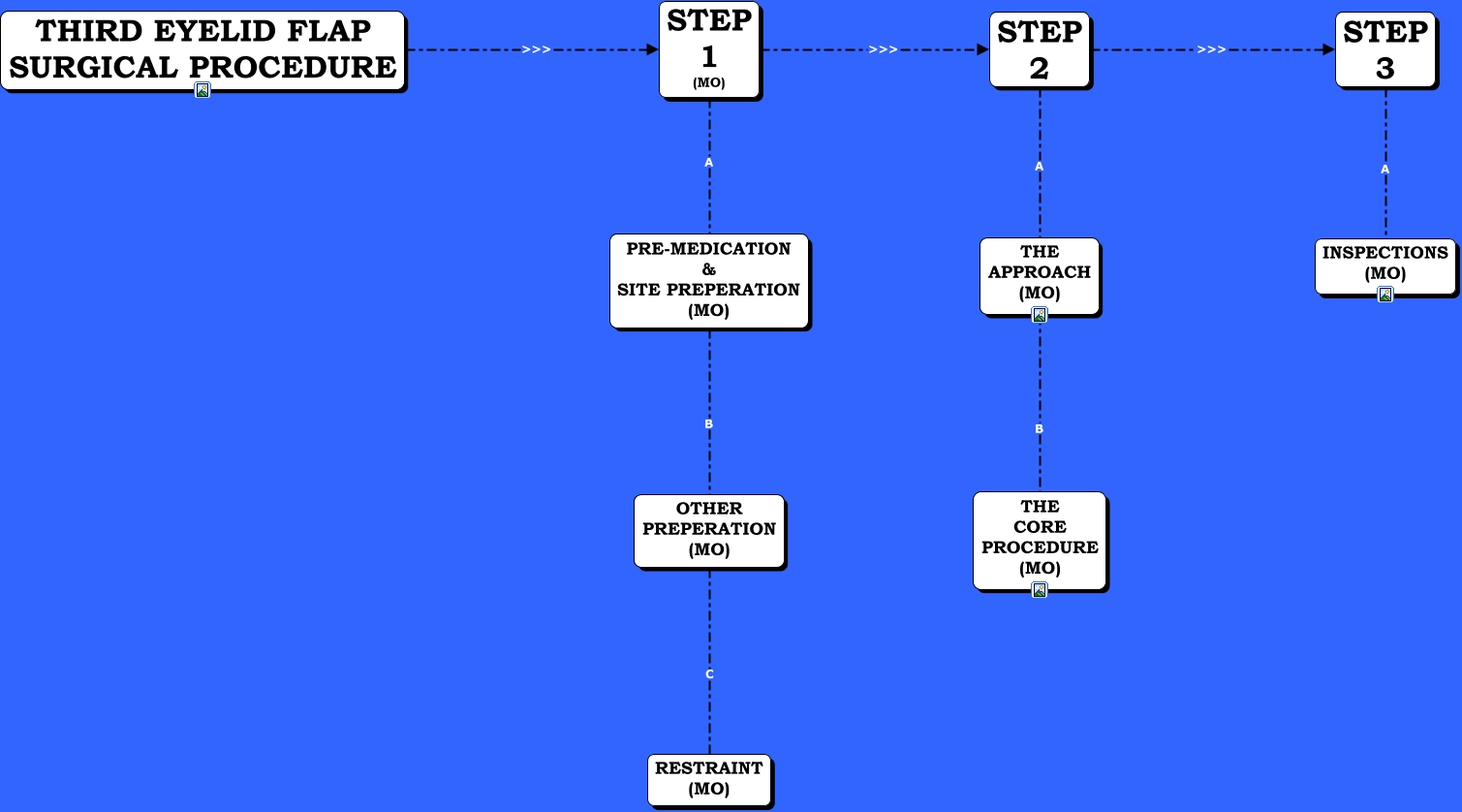 This Concept Map, created with IHMC CmapTools, has information related to: THIRD EYELID FLAP PROCEDURE, THE APPROACH (MO) B THE CORE PROCEDURE (MO), STEP 1 (MO) >>> STEP 2, STEP 2 A THE APPROACH (MO), STEP 2 >>> STEP 3, OTHER PREPERATION (MO) C RESTRAINT (MO), THIRD EYELID FLAP SURGICAL PROCEDURE >>> STEP 1 (MO), STEP 1 (MO) A PRE-MEDICATION & SITE PREPERATION (MO), STEP 3 A INSPECTIONS (MO), PRE-MEDICATION & SITE PREPERATION (MO) B OTHER PREPERATION (MO)