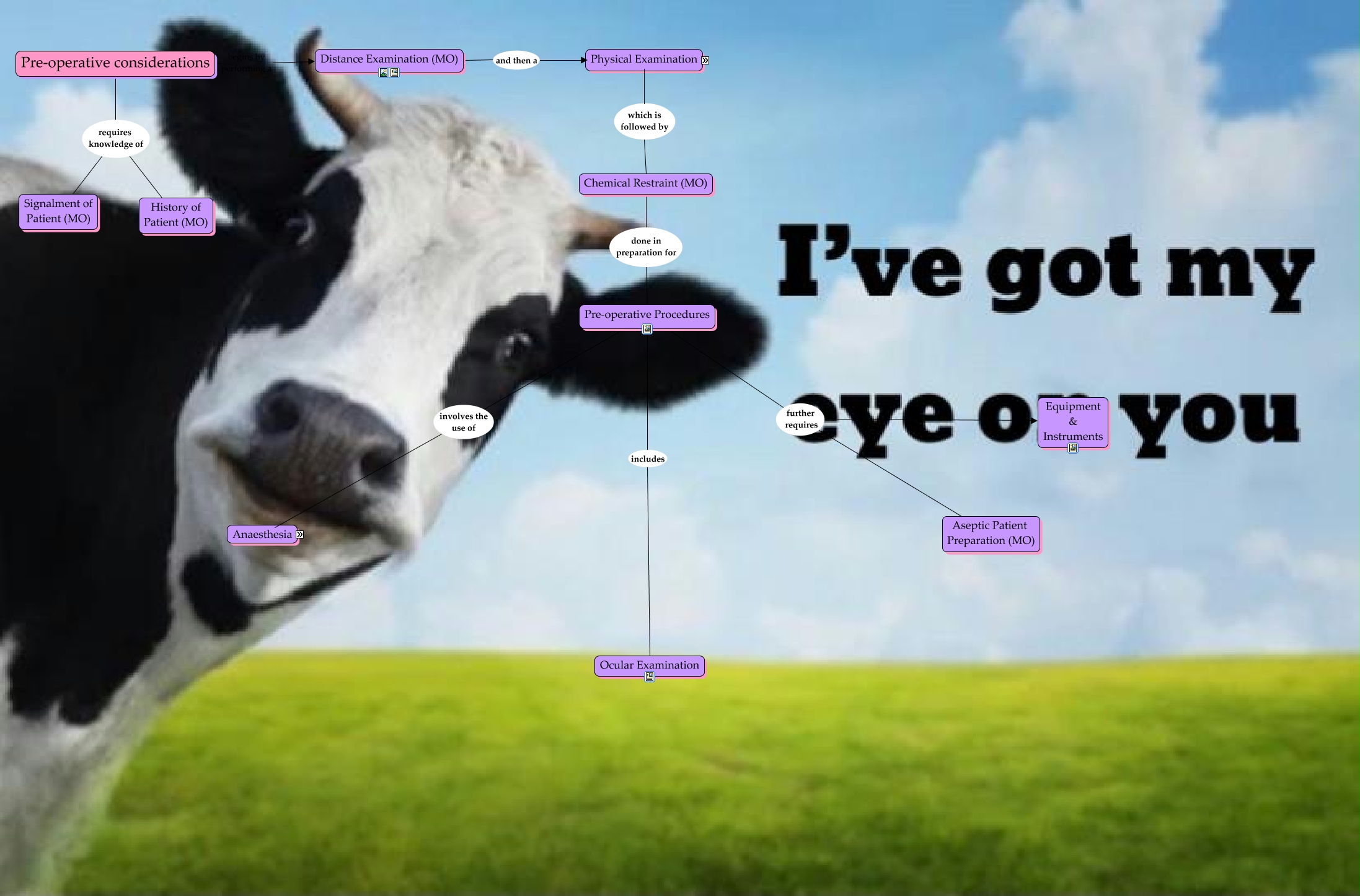 This Concept Map, created with IHMC CmapTools, has information related to: Pre-operative considerations, Regional Anaesthesia (MO) done for surgical procedures 4 Point Nerve Block (MO), Anaesthesia which is categorized into Local Anaesthesia (MO), Pre-operative considerations begins by performing a Distance Examination (MO), Anaesthesia requires Drugs, Pre-operative Procedures involves the use of Anaesthesia, Local Anaesthesia (MO) done for eye examinations Auriculopalpebral Nerve Block (MO), Physical Examination (MO) which is followed by Chemical Restraint (MO), Regional Anaesthesia (MO) done for surgical procedures Line Nerve Block (MO), Physical Restraint (MO) and is then followed by 5 Station Examination (MO), Pre-operative Procedures further requires Equipment & Instruments, Anaesthesia which is categorized into Regional Anaesthesia (MO), Distance Examination (MO) and then a Physical Examination (MO), Regional Anaesthesia (MO) done for surgical procedures Retrobulbar Nerve Block (MO), Pre-operative Procedures includes Ocular Examination, Pre-operative considerations requires knowledge of Signalment of Patient (MO), Anaesthesia requires Patient Monitoring (MO), Pre-operative Procedures further requires Aseptic Patient Preparation (MO), Regional Anaesthesia (MO) done for surgical procedures Peterson Nerve Block (MO), 5 Station Examination (MO) by which the patient is given an ASA Grade (MO), Physical Examination (MO) which firstly requires Physical Restraint (MO)