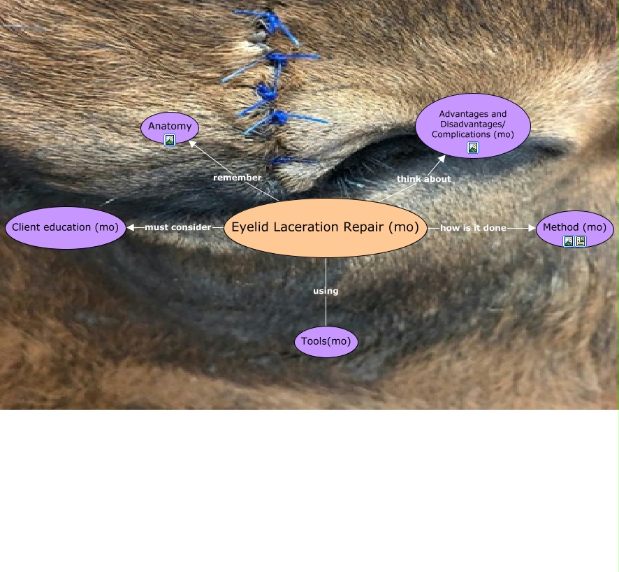 This Concept Map, created with IHMC CmapTools, has information related to: Eyelid laceration repair, Eyelid Laceration Repair (mo) remember Anatomy, Eyelid Laceration Repair (mo) think about Advantages and Disadvantages/ Complications (mo), Eyelid Laceration Repair (mo) how is it done Method (mo), Eyelid Laceration Repair (mo) using Tools(mo), Eyelid Laceration Repair (mo) must consider Client education (mo)