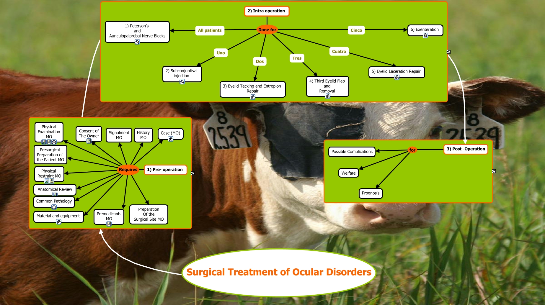 This Concept Map, created with IHMC CmapTools, has information related to: Group 3 Lab 7 - Eye Surgery EDIT ! COPY 4, 3) Post -Operation for Possible Complications, 1) Pre- operation Requires Premedicants MO, 2) Intra operation Done for 6) Exenteration, 1) Pre- operation Requires Presurgical Preparation of the Patient MO, 1) Pre- operation Requires Physical Examination MO, 1) Pre- operation Requires Anatomical Review, 2) Intra- Operation Procedure ???? 3) Post -Operation, 2) Intra operation Done for 2) Subconjuntival injection, 1) Pre- operation Requires Case (MO), 2) Intra operation Done for 1) Peterson's and Auriculopalprebal Nerve Blocks, 1) Pre- operation Requires Preparation Of the Surgical Site MO, Surgical Treatment of Ocular Disorders ???? 1) Pre- Operation Assessment & Preparation, 2) Intra operation Done for 4) Third Eyelid Flap and Removal, 1) Pre- operation Requires Consent of The Owner, 1) Pre- operation Requires Common Pathology, 1) Pre- operation Requires Physical Restraint MO, 3) Post -Operation for Welfare, 1) Pre- operation Requires History MO, 1) Pre- operation Requires Material and equipment, 2) Intra operation Done for 5) Eyelid Laceration Repair