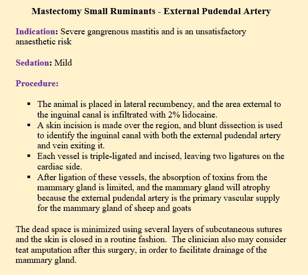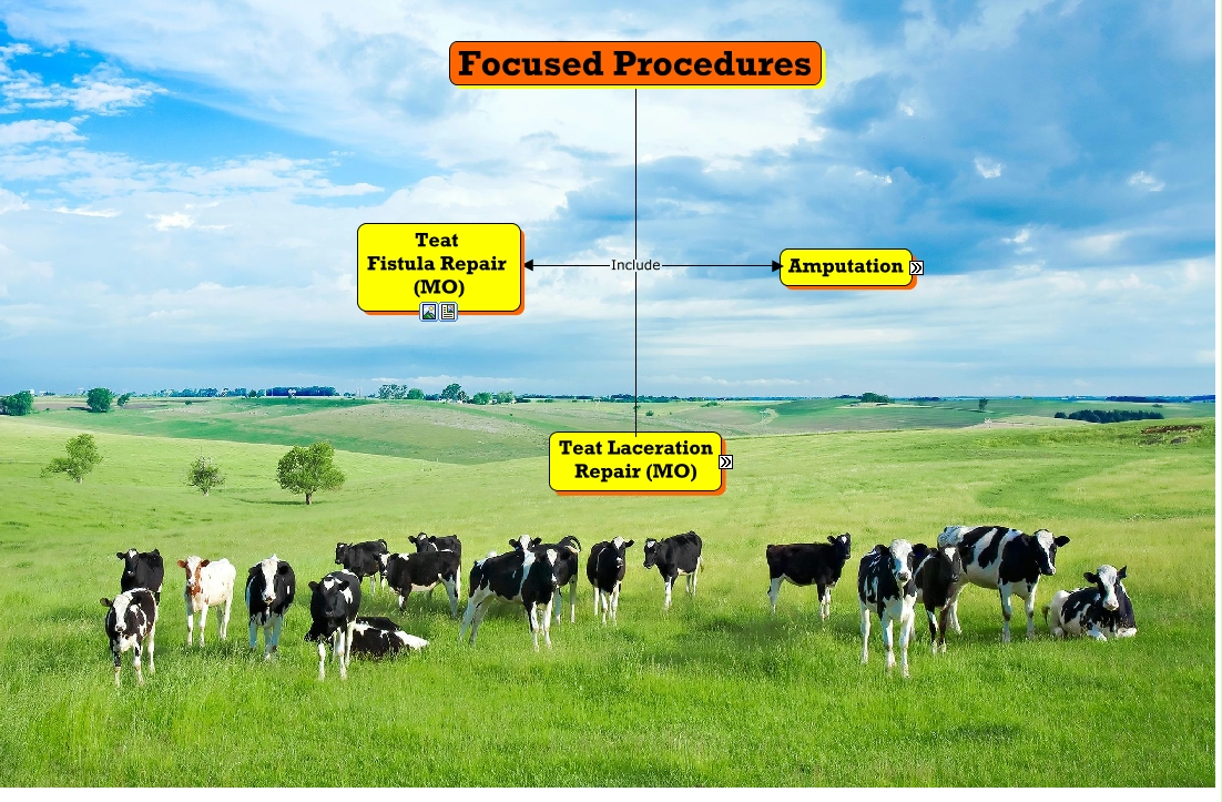 This Concept Map, created with IHMC CmapTools, has information related to: Focused Procedures, Teat Laceration Repair include Full Thickness/ Teat Cistern Laceration Repair, Amputation of Teat, Amputation of Supernumerary Teat (MO), Focused Procedures Include Teat Laceration Repair, Udder in Small Ruminants, Focused Procedures Include Amputation, Cows is done by Traditional Masectomy (MO), Amputation of Udder, Udder in Cows, Teat Laceration Repair include Emergency Teat Laceration Repair (MO), Focused Procedures Include Teat Fistula Repair (MO), Cows is done by Physiologic Mastectomy via Flank Laparotomy (MO), Teat due to Injury (MO), Teat due to Disease (MO)