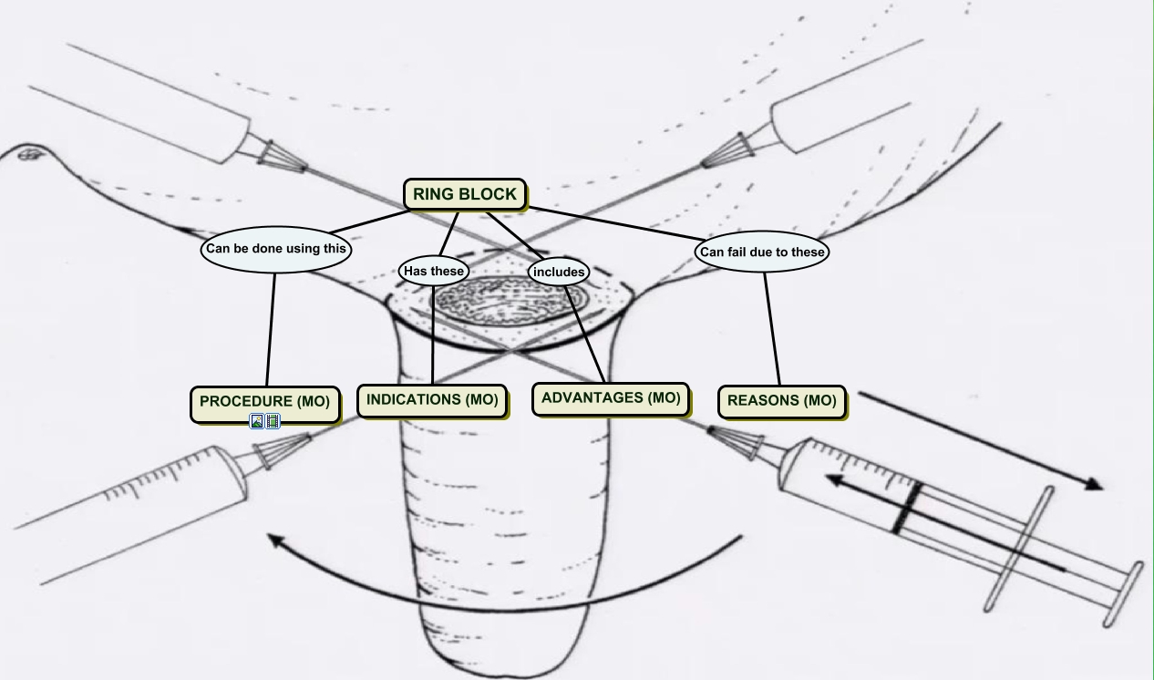 This Concept Map, created with IHMC CmapTools, has information related to: Ring Block, RING BLOCK Can fail due to these REASONS (MO), RING BLOCK Has these INDICATIONS (MO), RING BLOCK includes ADVANTAGES (MO), RING BLOCK Can be done using this PROCEDURE (MO)