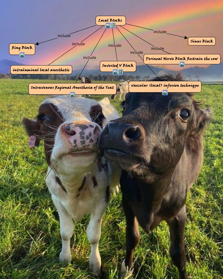 This Concept Map, created with IHMC CmapTools, has information related to: Local Nerve Blocks of Udder and Teat, Local Blocks include Sinus Block, Local Blocks include Intravenous Regional Anesthesia of the Teat, Local Blocks include Inverted V Block, Local Blocks include Perineal Nerve Block Restrain the cow, Local Blocks include intraluminal local anesthetic, Local Blocks include vascular (local) infusion technique, Local Blocks include Ring Block