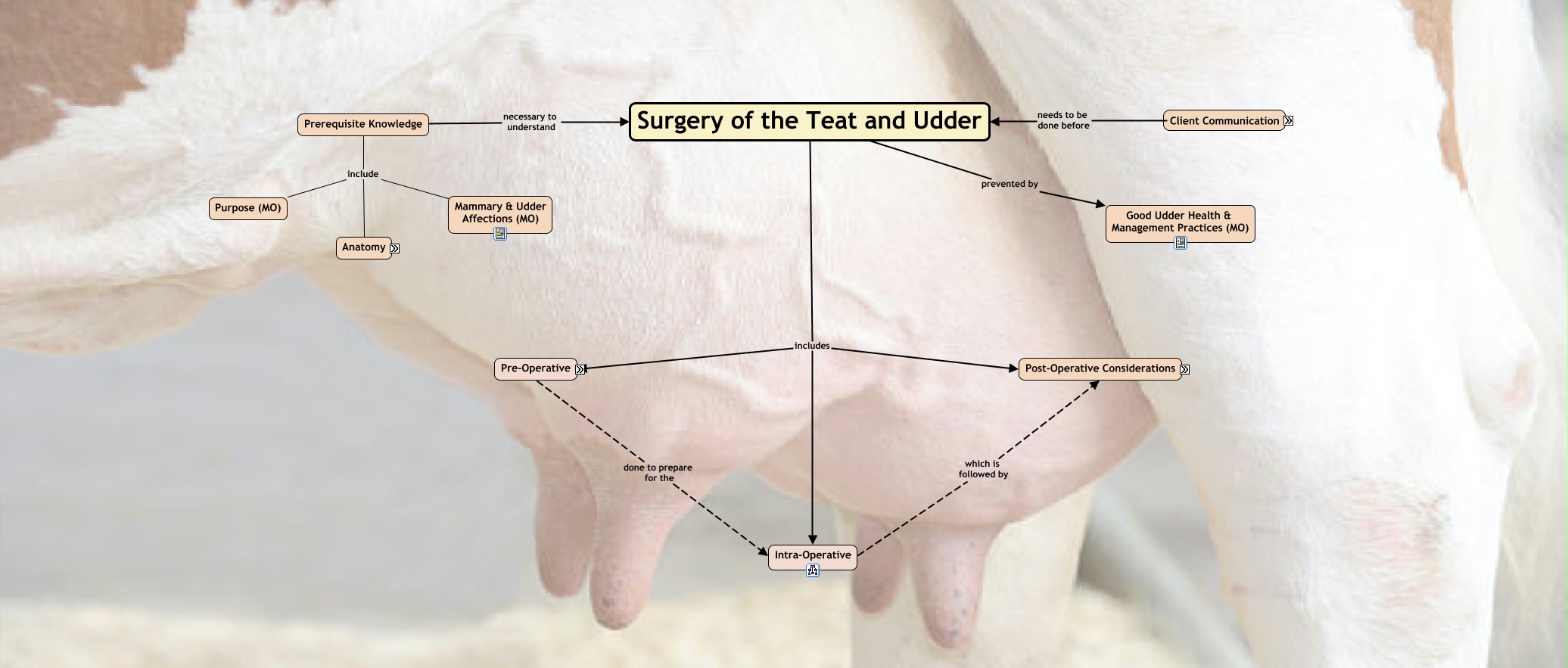 This Concept Map, created with IHMC CmapTools, has information related to: Surgery of the Teat and Udder Final 3, Prerequisite Knowledge include Purpose (MO), Pre-Operative Procedure involves Intravenous Regional Anaesthesia (MO), Post-Operative Considerations take into account Prognosis (MO), Surgery of the Teat and Udder prevented by Good Udder Health & Management Practices (MO), Post-Operative Considerations take into account Economical Impact (MO), Client Communication must entail Consent Form, Anatomy include Teat Anatomy, Pre-Operative Procedure involves Preparation for Surgery (MO), Surgery of the Teat and Udder includes Pre-Operative, Client Communication must entail Client Briefing (MO), Prerequisite Knowledge necessary to understand Surgery of the Teat and Udder, Anatomy include Mammary & Udder Affections (MO), Surgery of the Teat and Udder includes Post-Operative Considerations, Anatomy include Purpose (MO), Client Communication needs to be done before Surgery of the Teat and Udder, Pre-Operative Procedure involves Drugs, Intra-Operative which is followed by Post-Operative Considerations, Client Communication must entail Consent Form, Anatomy include Lymphatics & Neurovascular Supply, Post-Operative Considerations take into account Complications (MO)