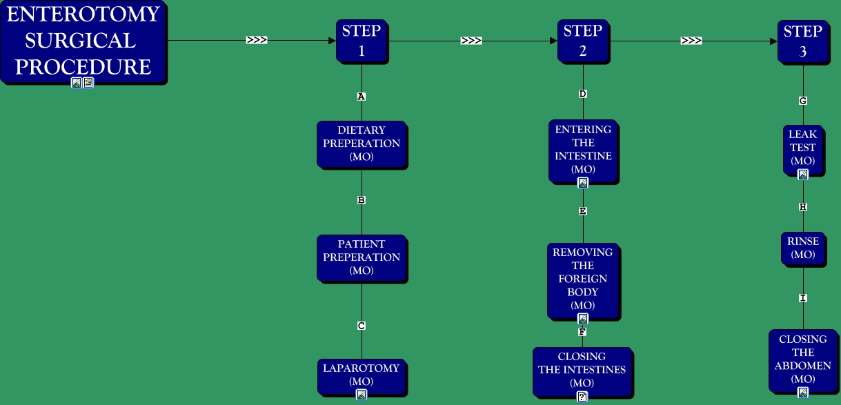 This Concept Map, created with IHMC CmapTools, has information related to: ENTEROTOMY SURGICAL PROCEDURE, LEAK TEST (MO) H RINSE (MO), ENTEROTOMY SURGICAL PROCEDURE >>> STEP 1, ENTERING THE INTESTINE (MO) E REMOVING THE FOREIGN BODY (MO), STEP 3 G LEAK TEST (MO), PATIENT PREPERATION (MO) C LAPAROTOMY (MO), DIETARY PREPERATION (MO) B PATIENT PREPERATION (MO), STEP 1 A DIETARY PREPERATION (MO), REMOVING THE FOREIGN BODY (MO) F CLOSING THE INTESTINES (MO), RINSE (MO) I CLOSING THE ABDOMEN (MO), STEP 2 >>> STEP 3, STEP 1 >>> STEP 2, STEP 2 D ENTERING THE INTESTINE (MO)