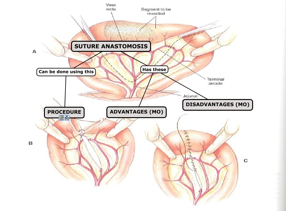 This Concept Map, created with IHMC CmapTools, has information related to: Suture Anastomosis, SUTURE ANASTOMOSIS Has these ADVANTAGES (MO), SUTURE ANASTOMOSIS Has these DISADVANTAGES (MO), SUTURE ANASTOMOSIS Can be done using this PROCEDURE