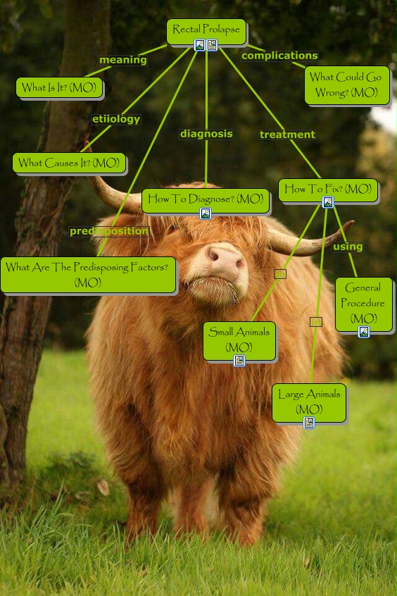 This Concept Map, created with IHMC CmapTools, has information related to: Rectal Prolapse Repair, How To Fix? (MO) using General Procedure (MO), Rectal Prolapse diagnosis How To Diagnose? (MO), Rectal Prolapse etiiology What Causes It? (MO), Rectal Prolapse complications What Could Go Wrong? (MO), Rectal Prolapse treatment How To Fix? (MO), Rectal Prolapse predisposition What Are The Predisposing Factors? (MO), Rectal Prolapse meaning What Is It? (MO), How To Fix? (MO) in Small Animals (MO), How To Fix? (MO) in Large Animals (MO)