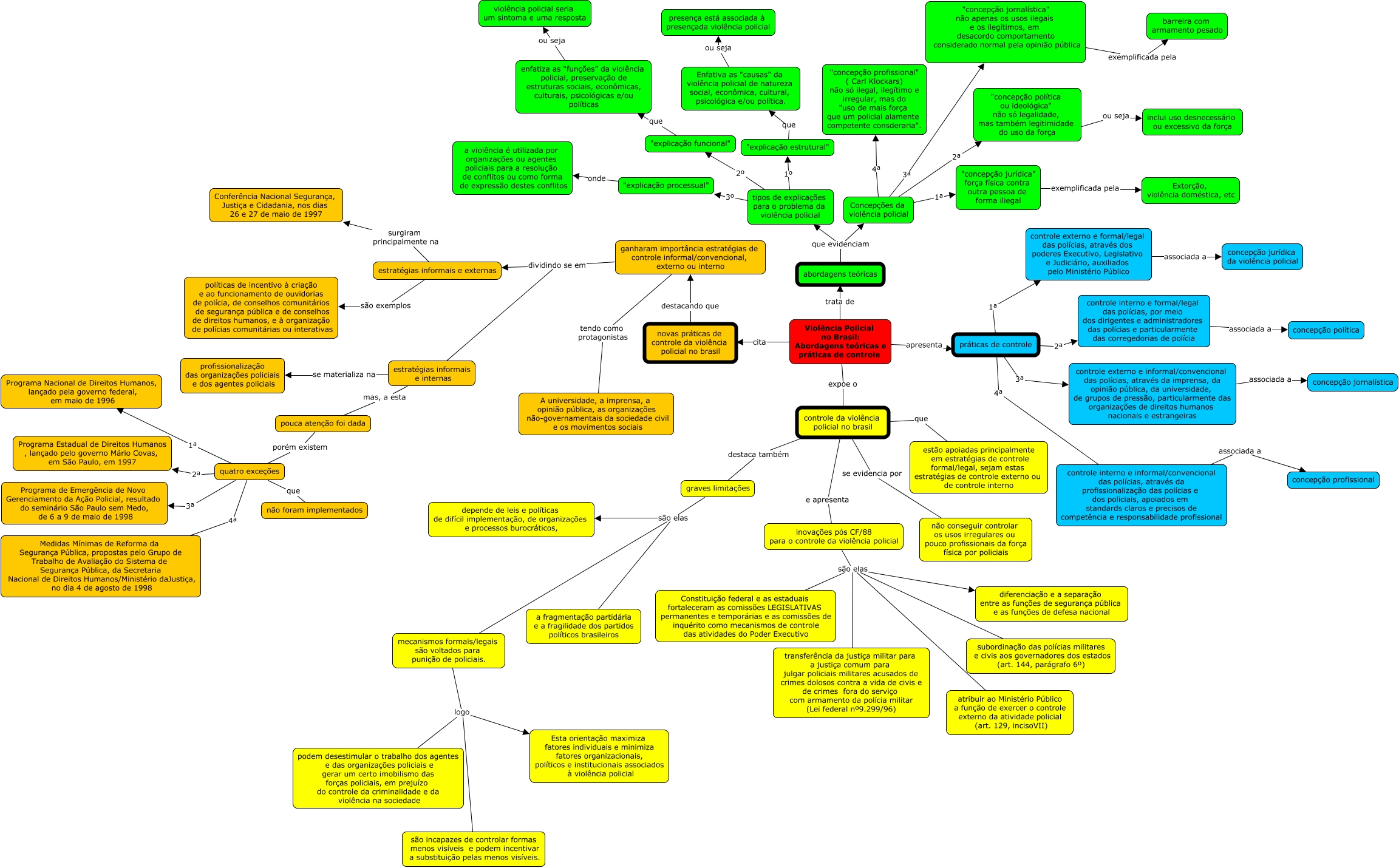 Este Cmap, tiene información relacionada con: ! Violência policial no Brasil- abordagens teóricas e práticas de controle, inovações pós CF/88 para o controle da violência policial são elas transferência da justiça militar para a justiça comum para julgar policiais militares acusados de crimes dolosos contra a vida de civis e de crimes fora do serviço com armamento da polícia militar (Lei federal nº9.299/96), controle externo e formal/legal das polícias, através dos poderes Executivo, Legislativo e Judiciário, auxiliados pelo Ministério Público associada a concepção jurídica da violência policial, "explicação estrutural" que Enfativa as "causas" da violência policial de natureza social, econômica, cultural, psicológica e/ou política., "concepção jornalística" não apenas os usos ilegais e os ilegítimos, em desacordo comportamento considerado normal pela opinião pública exemplificada pela barreira com armamento pesado, práticas de controle 2ª controle interno e formal/legal das polícias, por meio dos dirigentes e administradores das polícias e particularmente das corregedorias de polícia, controle interno e formal/legal das polícias, por meio dos dirigentes e administradores das polícias e particularmente das corregedorias de polícia associada a concepção política, Violência Policial no Brasil: Abordagens teóricas e práticas de controle trata de abordagens teóricas, tipos de explicações para o problema da violência policial 2º "explicação funcional", graves limitações são elas mecanismos formais/legais são voltados para punição de policiais., controle da violência policial no brasil que estão apoiadas principalmente em estratégias de controle formal/legal, sejam estas estratégias de controle externo ou de controle interno, inovações pós CF/88 para o controle da violência policial são elas subordinação das polícias militares e civis aos governadores dos estados (art. 144, parágrafo 6º), controle interno e informal/convencional das polícias, através da profissionalização das polícias e dos policiais, apoiados em standards claros e precisos de competência e responsabilidade profissional associada a concepção profissional, ganharam importância estratégias de controle informal/convencional, externo ou interno dividindo se em estratégias informais e internas, controle da violência policial no brasil destaca também graves limitações, novas práticas de controle da violência policial no brasil destacando que ganharam importância estratégias de controle informal/convencional, externo ou interno, quatro exceções 3ª Programa de Emergência de Novo Gerenciamento da Ação Policial, resultado do seminário São Paulo sem Medo, de 6 a 9 de maio de 1998, práticas de controle 3ª controle externo e informal/convencional das polícias, através da imprensa, da opinião pública, da universidade, de grupos de pressão, particularmente das organizações de direitos humanos nacionais e estrangeiras, inovações pós CF/88 para o controle da violência policial são elas atribuir ao Ministério Público a função de exercer o controle externo da atividade policial (art. 129, incisoVII), quatro exceções 1ª Programa Nacional de Direitos Humanos, lançado pela governo federal, em maio de 1996, "concepção jurídica" força física contra outra pessoa de forma iliegal exemplificada pela Extorção, violência doméstica, etc