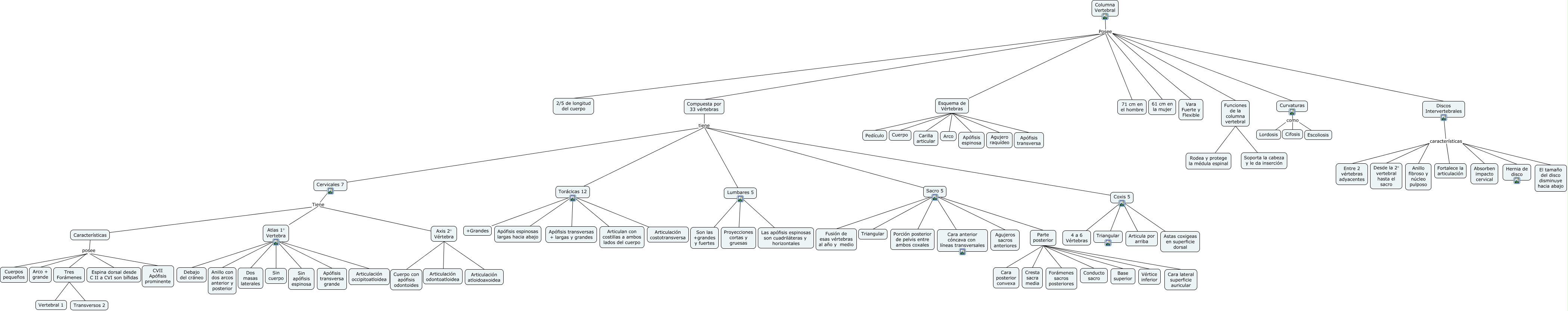 Este Cmap, tiene información relacionada con: Columna Vertebral, 4 a 6 Vértebras Coxis 5, 2/5 de longitud del cuerpo Posee Columna Vertebral, Articulación atloidoaxoidea Axis 2° Vértebra, Pedículo Esquema de Vértebras, Base superior Parte posterior, Sin cuerpo Atlas 1° Vertebra, Apófisis transversa grande Atlas 1° Vertebra, Agujeros sacros anteriores Sacro 5, Conducto sacro Parte posterior, Compuesta por 33 vértebras Posee Columna Vertebral, Vértice inferior Parte posterior, Triangular Sacro 5, Astas coxigeas en superficie dorsal Coxis 5, Escoliosis como Curvaturas, Son las +grandes y fuertes Lumbares 5, Cuerpos pequeños posee Características, Cuerpo Esquema de Vértebras, Apófisis espinosa Esquema de Vértebras, El tamaño del disco disminuye hacia abajo características Discos Intervertebrales, Anillo con dos arcos anterior y posterior Atlas 1° Vertebra