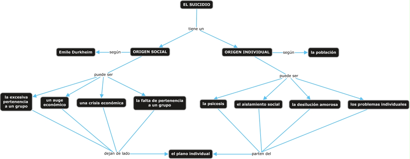 This Concept Map, created with IHMC CmapTools, has information related to: el suicidio 2, ORIGEN SOCIAL puede ser la falta de pertenencia a un grupo, la excesiva pertenencia a un grupo dejan de lado el plano individual, ORIGEN INDIVIDUAL puede ser el aislamiento social, ORIGEN SOCIAL según Emile Durkheim, ORIGEN INDIVIDUAL puede ser la desilución amorosa, ORIGEN SOCIAL puede ser la excesiva pertenencia a un grupo, la falta de pertenencia a un grupo dejan de lado el plano individual, una crisis económica dejan de lado el plano individual, ORIGEN INDIVIDUAL según la población, un auge económico dejan de lado el plano individual, EL SUICIDIO tiene un ORIGEN SOCIAL, la desilución amorosa parten del el plano individual, ORIGEN INDIVIDUAL puede ser la psicosis, ORIGEN SOCIAL puede ser un auge económico, la psicosis parten del el plano individual, ORIGEN SOCIAL puede ser una crisis económica, los problemas individuales parten del el plano individual, el aislamiento social parten del el plano individual, EL SUICIDIO tiene un ORIGEN INDIVIDUAL, ORIGEN INDIVIDUAL puede ser los problemas individuales