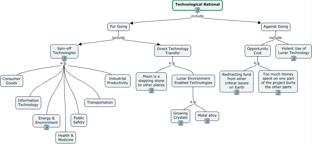 This Concept Map, created with IHMC CmapTools, has information related to: Rationale - Technological, Spin-off Technologies e.g. Transportation, Direct Technology Transfer e.g. Moon is a stepping stone to other places, Spin-off Technologies e.g. Health & Medicine, Technological Rational include For Going, Technological Rational include Against Going, Spin-off Technologies e.g. Energy & Environment, Lunar Environment Enabled Technologies e.g. Growing Crystals, Against Going include Opportunity Cost, Lunar Environment Enabled Technologies e.g. Metal alloy, Spin-off Technologies e.g. Consumer Goods, For Going include Spin-off Technologies, Opportunity Cost e,g. Redirecting fund from other critical issues on Earth, Spin-off Technologies e.g. Public Safety, For Going include Direct Technology Transfer, Direct Technology Transfer e.g. Lunar Environment Enabled Technologies, Against Going include Violent Use of Lunar Technology, Spin-off Technologies e.g. Industrial Productivity, Opportunity Cost e,g. Too much money spent on one part of the project burts the other parts, Spin-off Technologies e.g. Information Technology