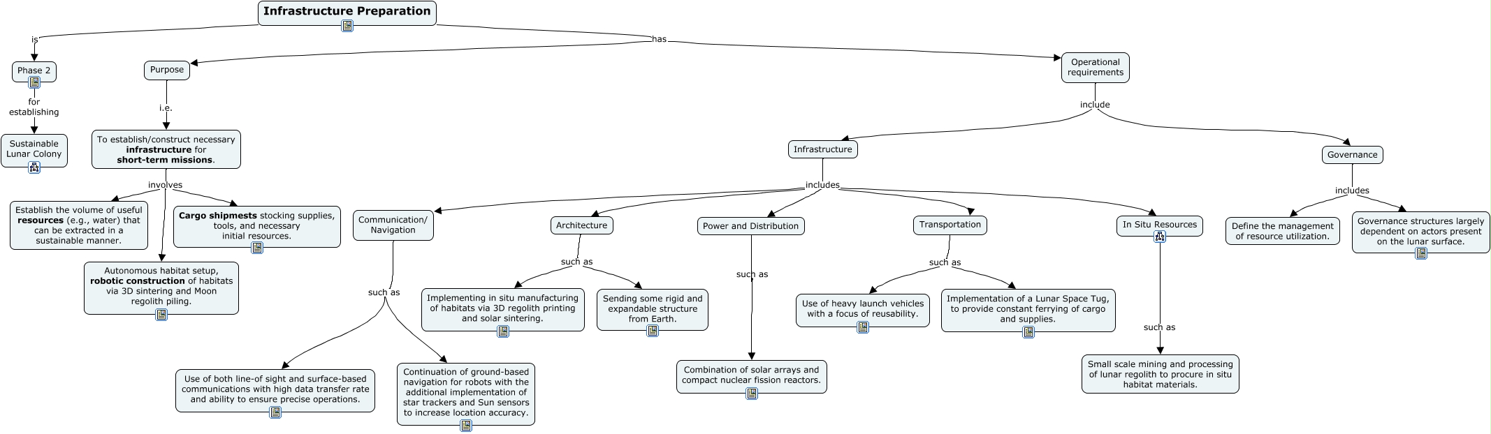 This Concept Map, created with IHMC CmapTools, has information related to: Roadmap - Phase 2 - Infrastructure Preparation, Architecture such as Sending some rigid and expandable structure from Earth., To establish/construct necessary infrastructure for short-term missions. involves Cargo shipmests stocking supplies, tools, and necessary initial resources., Power and Distribution such as Combination of solar arrays and compact nuclear fission reactors., Governance includes Define the management of resource utilization., Infrastructure includes Power and Distribution, Infrastructure includes In Situ Resources, To establish/construct necessary infrastructure for short-term missions. involves Autonomous habitat setup, robotic construction of habitats via 3D sintering and Moon regolith piling., Infrastructure includes Architecture, In Situ Resources such as Small scale mining and processing of lunar regolith to procure in situ habitat materials., Transportation such as Implementation of a Lunar Space Tug, to provide constant ferrying of cargo and supplies., Infrastructure Preparation is Phase 2, Infrastructure includes Transportation, Infrastructure includes Communication/ Navigation, Communication/ Navigation such as Continuation of ground-based navigation for robots with the additional implementation of star trackers and Sun sensors to increase location accuracy., Communication/ Navigation such as Use of both line-of sight and surface-based communications with high data transfer rate and ability to ensure precise operations., Infrastructure Preparation has Operational requirements, Phase 2 for establishing Sustainable Lunar Colony, To establish/construct necessary infrastructure for short-term missions. involves Establish the volume of useful resources (e.g., water) that can be extracted in a sustainable manner., Transportation such as Use of heavy launch vehicles with a focus of reusability., Operational requirements include Infrastructure