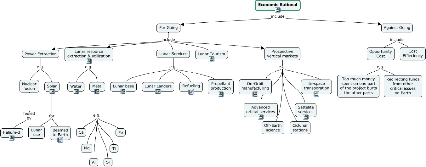 This Concept Map, created with IHMC CmapTools, has information related to: Rationale - Economic, Against Going include Opportunity Cost, Metal e.g. Al, For Going include Lunar resource extraction & utilization, For Going include Lunar Tourism, Prospective vertical markets e.g. Ciclunar stations, Lunar Services e.g. Lunar base, For Going include Power Extraction, Prospective vertical markets e.g. Off-Earth science, Prospective vertical markets e.g. Sattelite services, Prospective vertical markets e.g. Advanced orbital services, Nuclear fusion feuled by Helium-3, Economic Rational include Against Going, Opportunity Cost e,g. Redirecting funds from other critical issues on Earth, Solar for Lunar use, Against Going include Cost Effieciency, Metal e.g. Ca, Power Extraction e.g. Solar, Power Extraction e.g. Nuclear fusion, Lunar resource extraction & utilization e.g. Water, Metal e.g. Fe
