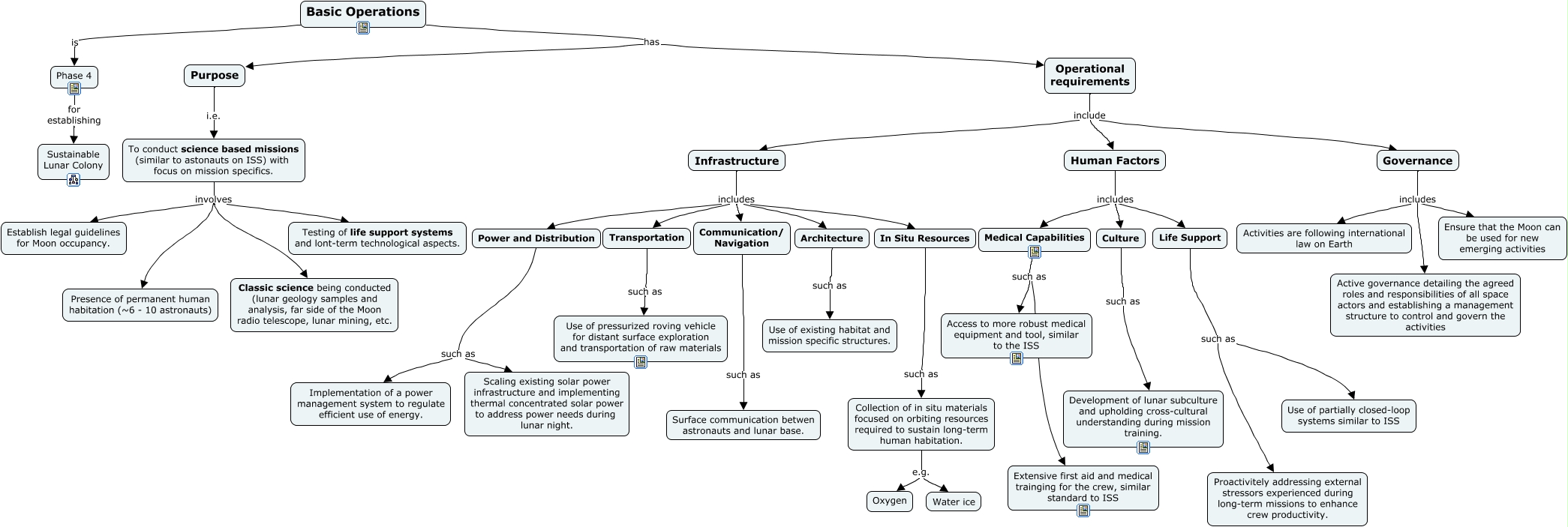 This Concept Map, created with IHMC CmapTools, has information related to: Roadmap - Phase 4 - Basic Operations, Infrastructure includes Power and Distribution, Human Factors includes Medical Capabilities, Culture such as Development of lunar subculture and upholding cross-cultural understanding during mission training., Human Factors includes Culture, Operational requirements include Infrastructure, Communication/ Navigation such as Surface communication betwen astronauts and lunar base., Power and Distribution such as Scaling existing solar power infrastructure and implementing thermal concentrated solar power to address power needs during lunar night., Infrastructure includes Architecture, Basic Operations is Phase 4, Governance includes Activities are following international law on Earth, Infrastructure includes Transportation, Human Factors includes Life Support, Medical Capabilities such as Access to more robust medical equipment and tool, similar to the ISS, Infrastructure includes Communication/ Navigation, Basic Operations has Operational requirements, To conduct science based missions (similar to astonauts on ISS) with focus on mission specifics. involves Establish legal guidelines for Moon occupancy., In Situ Resources such as Collection of in situ materials focused on orbiting resources required to sustain long-term human habitation., Operational requirements include Governance, Architecture such as Use of existing habitat and mission specific structures., To conduct science based missions (similar to astonauts on ISS) with focus on mission specifics. involves Presence of permanent human habitation (~6 - 10 astronauts)