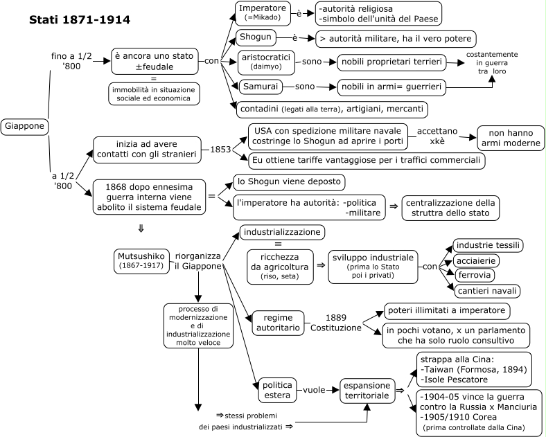 This Concept Map, created with IHMC CmapTools, has information related to: 05c_giappone, è ancora uno stato ±feudale con contadini (legati alla terra), artigiani, mercanti, sviluppo industriale (prima lo Stato poi i privati) con cantieri navali, è ancora uno stato ±feudale con aristocratici (daimyo), aristocratici (daimyo) sono nobili proprietari terrieri, industrializzazione = ricchezza da agricoltura (riso, seta), USA con spedizione militare navale costringe lo Shogun ad aprire i porti accettano xkè non hanno armi moderne, processo di modernizzazione e di industrializzazione molto veloce ⇒stessi problemi dei paesi industrializzati ⇒ espansione territoriale, sviluppo industriale (prima lo Stato poi i privati) con acciaierie, politica estera vuole espansione territoriale, Mutsushiko (1867-1917) riorganizza il Giappone industrializzazione, Giappone a 1/2 '800 1868 dopo ennesima guerra interna viene abolito il sistema feudale, è ancora uno stato ±feudale con Shogun, Imperatore (=Mikado) è -autorità religiosa -simbolo dell'unità del Paese, Samurai sono nobili in armi= guerrieri, espansione territoriale ⇒ strappa alla Cina: -Taiwan (Formosa, 1894) -Isole Pescatore, ricchezza da agricoltura (riso, seta) ⇒ sviluppo industriale (prima lo Stato poi i privati), 1868 dopo ennesima guerra interna viene abolito il sistema feudale = lo Shogun viene deposto, sviluppo industriale (prima lo Stato poi i privati) con ferrovia, è ancora uno stato ±feudale = immobilità in situazione sociale ed economica, Mutsushiko (1867-1917) riorganizza il Giappone processo di modernizzazione e di industrializzazione molto veloce