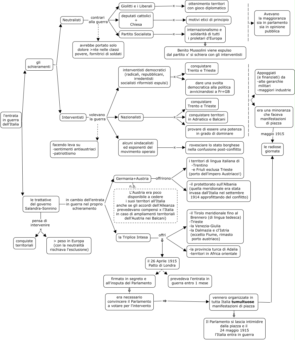 | </mtext> </math> . era una minoranza che faceva manifestazioni di piazza, la Triplice Intesa offrì ⇓ -il Tirolo meridionale fino al Brennero (di lingua tedesca) -Trieste -la Venezia-Giulia -la Dalmazia e cl'Istria (eccetto Fiume, rimasto porto austriaco), Neutralisti contrari alla guerra avrebbe portato solo dolore >nte nelle classi povere, fornitrici di soldati, il 26 Aprile 1915 Patto di Londra . prevedeva l'entrata in guerra entro 1 mese, Interventisti volevano la guerra facendo leva su -sentimenti antiaustriaci -patriottismo, Nazionalisti x conquistare territori in Adriatico e Balcani, internazionalismo e solidarità di tutti i proletari d'Europa ⇓ Benito Mussolini viene espulso dal partito x' si schiera con gli interventisti, interventisti democratici (radicali, repubblicani, irredentisti socialisti riformisti espulsi) x conquistare Trento e Trieste, era una minoranza che faceva manifestazioni di piazza maggio 1915 le radiose giornate