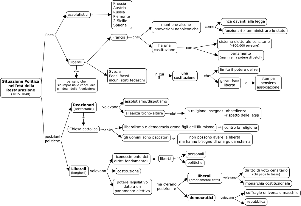 This Concept Map, created with IHMC CmapTools, has information related to: 04_politica_restaurazione, democratici volevano suffragio universale maschile, Chiesa cattolica xkè liberalismo e democrazia erano figli dell'Illumismo, Situazione Politica nell'età della Restaurazione (1815-1848) Paesi liberali, Chiesa cattolica xkè gli uomini sono peccatori, Liberali (borghesi) volevano potere legislativo dato a un parlamento elettivo, riconoscimento dei diritti fondamentali = libertà, liberali . Svezia Paesi Bassi alcuni stati tedeschi, Francia che mantiene alcune innovazioni napoleoniche, una costituzione che garantisce libertà, alleanza trono-altare xkè la religione insegna: -obbedienza -rispetto delle leggi, libertà . personali, liberali . Francia, Svezia Paesi Bassi alcuni stati tedeschi in cui ∃ una costituzione, ha una costituzione con parlamento (ma il re ha potere di veto!), Francia che ha una costituzione, democratici volevano repubblica, Reazionari (aristocratici) + Chiesa cattolica, assolutistici . Prussia Austria Russia Piemonte 2 Sicilie Spagna, liberali (propriamente detti) volevano monarchia costituzionale, gli uomini sono peccatori ⇒ non possono avere la libertà ma hanno bisogno di una guida esterna