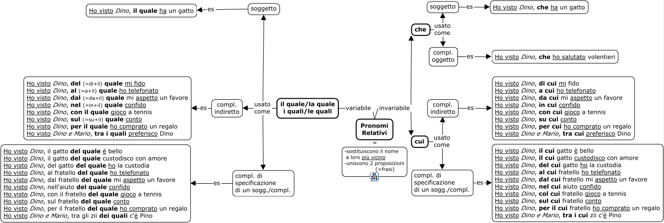 This Concept Map, created with IHMC CmapTools, has information related to: relativo, compl. di specificazione di un sogg./compl. es Ho visto Dino, il gatto del quale è bello Ho visto Dino, il gatto del quale custodisco con amore Ho visto Dino, del gatto del quale ho la custodia Ho visto Dino, al fratello del quale ho telefonato Ho visto Dino, dal fratello del quale mi aspetto un favore Ho visto Dino, nell'aiuto del quale confido Ho visto Dino, con il fratello del quale gioco a tennis Ho visto Dino, sul fratello del quale conto Ho visto Dino, per il fratello del quale ho comprato un regalo Ho visto Dino e Mario, tra gli zii dei quali c'è Pino, Pronomi Relativi invariabile che, Pronomi Relativi variabile il quale/la quale i quali/le quali, soggetto es Ho visto Dino, il quale ha un gatto, che usato come compl. oggetto, compl. indiretto es Ho visto Dino, del (=di+il) quale mi fido Ho visto Dino, al (=a+il) quale ho telefonato Ho visto Dino, dal (=da+il) quale mi aspetto un favore Ho visto Dino, nel (=in+il) quale confido Ho visto Dino, con il quale gioco a tennis Ho visto Dino, sul (=su+il) quale conto Ho visto Dino, per il quale ho comprato un regalo Ho visto Dino e Mario, tra i quali preferisco Dino, Pronomi Relativi = -sostituiscono il nome a loro più vicino -uniscono 2 proposizioni (=frasi), cui usato come compl. indiretto, cui usato come compl. di specificazione di un sogg./compl., il quale/la quale i quali/le quali usato come compl. di specificazione di un sogg./compl., Pronomi Relativi invariabile cui, il quale/la quale i quali/le quali usato come compl. indiretto, il quale/la quale i quali/le quali usato come soggetto, compl. oggetto es Ho visto Dino, che ho salutato volentieri, compl. di specificazione di un sogg./compl. es Ho visto Dino, il cui gatto è bello Ho visto Dino, il cui gatto custodisco con amore Ho visto Dino, del cui gatto ho la custodia Ho visto Dino, al cui fratello ho telefonato Ho visto Dino, dal cui fratello mi aspetto un favore Ho visto Dino, nel cui aiuto confido Ho visto Dino, col cui fratello gioco a tennis Ho visto Dino, sul cui fratello conto Ho visto Dino, per il cui fratello ho comprato un regalo Ho visto Dino e Mario, tra i cui zii c'è Pino, compl. indiretto es Ho visto Dino, di cui mi fido Ho visto Dino, a cui ho telefonato Ho visto Dino, da cui mi aspetto un favore Ho visto Dino, in cui confido Ho visto Dino, con cui gioco a tennis Ho visto Dino, su cui conto Ho visto Dino, per cui ho comprato un regalo Ho visto Dino e Mario, tra cui preferisco Dino, soggetto es Ho visto Dino, che ha un gatto, che usato come soggetto