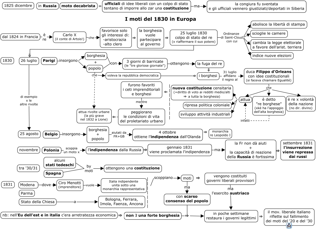 This Concept Map, created with IHMC CmapTools, has information related to: 07_moti 30, duca Filippo d'Orleans con idee costituzionali (si faceva chiamare Egualité) che è re x volontà della nazione (no dir. divino), moti ma con scarso consenso del popolo, furono favoriti i ceti imprenditoriali e borghesi mentre peggiorano le condizioni di vita del proletariato urbano, Parigi insorgono borghesia, popolo che attua rivolte urbane (la più grave nel 1832 a Lione), 25 luglio 1830 colpo di stato del re (x riaffermare il suo potere) ⇓ 26 luglio, Belgio insorgono borghesia + popolo, 26 luglio di esempio x le altre rivolte 25 agosto, 25 luglio 1830 colpo di stato del re (x riaffermare il suo potere) Ordinanze di Saint-Cloud con cui cambia la legge elettorale a favore dell'arist. terriera, moto decabrista = ufficiali di idee liberali con un colpo di stato tentano di imporre allo zar una costituzione, Stato della Chiesa a Bologna, Ferrara, Imola, Faenza, Ancona, peggiorano le condizioni di vita del proletariato urbano ⇐ attua rivolte urbane (la più grave nel 1832 a Lione), ufficiali di idee liberali con un colpo di stato tentano di imporre allo zar una costituzione ma la congiura fu sventata e gli ufficiali vennero giustiziati/deportati in Siberia, attua . sviluppo attività industriali, attua . ripresa politica coloniale, Carlo X (il conte di Artois!) che favorisce solo gli interessi di: -aristocrazia -alto clero, Parigi insorgono popolo, con scarso consenso del popolo ⇒ in poche settimane restaura i governi legittimi, moti ⇒ vengono costituiti governi liberali provvisori, favorisce solo gli interessi di: -aristocrazia -alto clero ⇒ la borghesia vuole partecipare al governo