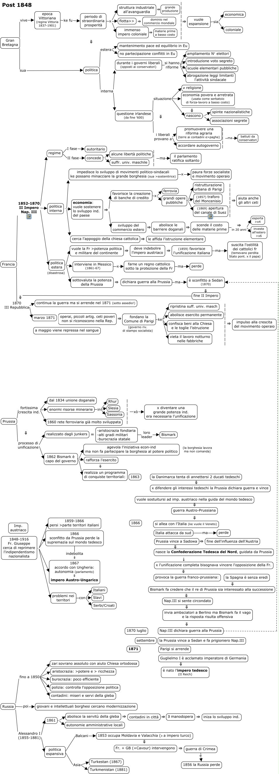 This Concept Map, created with IHMC CmapTools, has information related to: 05_post48b, 1861 . autonomie amministrative locali, 1862 Bismark è capo del governo . agevola l'iniziativa econ-ind ma non fa partecipare la borghesia al potere politico, problemi nei territori con Serbi/Croati, la Spagna è senza eredi ⇓ Bismark fa credere che il re di Prussia sia interessato alla successione, Nap:III dichiara guerra alla Prussia . è sconfitto a Sedan (1870), -aristocrazia fondiaria -alti gradi militari -burocrazia statale loro leader Bismark, abolisce la servitù della gleba ⇒ contadini in città, x l'unificazione completa bisognava vincere l'opposizione della Fr. ⇓ provoca la guerra franco-prussiana:, 1862 Bismark è capo del governo . rafforza l'esercito, politica estera . interviene in Messico (1861-67), durante i governi liberali (opposti ai conservatori) si hanno riforme scuole elementari pubbliche, guerra di Crimea e 1856 la Russia perde, 1862 Bismark è capo del governo . realizza un programma di conquiste territoriali:, (1859) favorisce l'unificazione italiana ma suscita l'ostilità dei cattolici fr (temevano perdita Stato pont. x il papa), vuole la Fr >potenza politica e militare del continente ⇒ deve indebolire l'impero austriaco, Russia Alessandro I (1855-1881) 1861, | | | | | | | | ⇒ aiuta anche gli altri ceti, nasce la Confederazione Tedesca del Nord, guidata da Prussia ↓ x l'unificazione completa bisognava vincere l'opposizione della Fr., cerca l'appoggio della chiesa cattolica ⇒ le affida l'istruzione elementare, politica espansiva Asia Turkestan (1867)