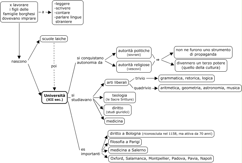 Questa Cmap, creata con IHMC CmapTools, contiene informazioni relative a: 03_universita, x lavorare i figli delle famiglie borghesi dovevano imprare nascono Università (XII sec.), autorità politiche (sovrani) ⇒ non ne furono uno strumento di propaganda, Università (XII sec.) si studiavano teologia (le Sacre Sritture), autorità religiose (vescovi) ⇒ non ne furono uno strumento di propaganda, Università (XII sec.) es importanti medicina a Salerno, scuole laiche poi Università (XII sec.), Università (XII sec.) si studiavano diritto (studi giuridici), x lavorare i figli delle famiglie borghesi dovevano imprare nascono scuole laiche, Università (XII sec.) es importanti diritto a Bologna (riconosciuta nel 1158, ma attiva da 70 anni), autorità religiose (vescovi) ⇒ divennero un terzo potere (quello della cultura), Università (XII sec.) es importanti filosofia a Parigi, arti liberali trivio grammatica, retorica, logica, Università (XII sec.) si studiavano medicina, arti liberali quadrivio aritmetica, geometria, astronomia, musica, Università (XII sec.) si conquistano autonomia da autorità politiche (sovrani), x lavorare i figli delle famiglie borghesi dovevano imprare a -leggere -scrivere -contare -parlare lingue straniere, autorità politiche (sovrani) ⇒ divennero un terzo potere (quello della cultura), Università (XII sec.) es importanti Oxford, Salamanca, Montpellier, Padova, Pavia, Napoli, Università (XII sec.) si studiavano arti liberali, Università (XII sec.) si conquistano autonomia da autorità religiose (vescovi)
