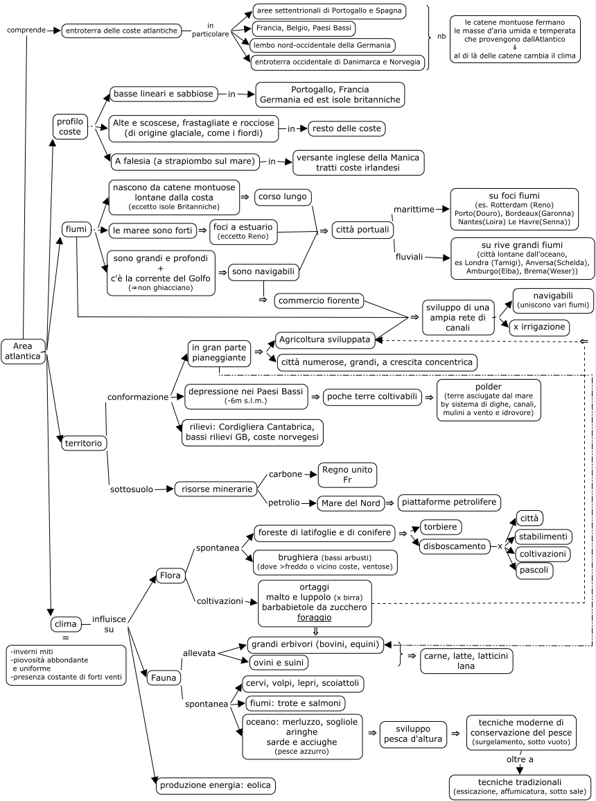 This Concept Map, created with IHMC CmapTools, has information related to: area atlantica, disboscamento x coltivazioni, territorio conformazione depressione nei Paesi Bassi (-6m s.l.m.), fiumi . le maree sono forti, fiumi ⇒ sviluppo di una ampia rete di canali, entroterra delle coste atlantiche in particolare Francia, Belgio, Paesi Bassi, Mare del Nord ⇒ piattaforme petrolifere, sono navigabili ⇒ città portuali, Fauna allevata grandi erbivori (bovini, equini), depressione nei Paesi Bassi (-6m s.l.m.) ⇒ poche terre coltivabili, fiumi . sono grandi e profondi + c'è la corrente del Golfo (⇒non ghiacciano), sono navigabili ⇒ commercio fiorente, sviluppo di una ampia rete di canali . x irrigazione, clima = -inverni miti -piovosità abbondante e uniforme -presenza costante di forti venti, entroterra delle coste atlantiche in particolare aree settentrionali di Portogallo e Spagna, fiumi . nascono da catene montuose lontane dalla costa (eccetto isole Britanniche), Area atlantica . territorio, oceano: merluzzo, sogliole aringhe sarde e acciughe (pesce azzurro) ⇒ sviluppo pesca d'altura, in gran parte pianeggiante ⇒ città numerose, grandi, a crescita concentrica, ortaggi malto e luppolo (x birra) barbabietole da zucchero foraggio ⇐ Agricoltura sviluppata, Flora spontanea foreste di latifoglie e di conifere
