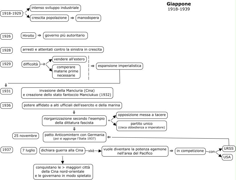 This Concept Map, created with IHMC CmapTools, has information related to: 13_giappone, riorganizzazione secondo l'esempio della dittatura fascista ⇓ patto Anticomintern con Germania (poi si aggiunge l'Italia 1937), dichiara guerra alla Cina . conquistano le > maggiori città della Cina nord-orientale e le governano in modo spietato, riorganizzazione secondo l'esempio della dittatura fascista = partito unico (cieca obbedienza a imperatore), riorganizzazione secondo l'esempio della dittatura fascista = opposizione messa a tacere, espansione imperialistica ⇓ 1931, difficoltà a comperare materie prime necessarie, Hiroito ⇒ governo più autoritario, in competizione con USA, dichiara guerra alla Cina xkè vuole diventare la potenza egemone nell'area del Pacifico, crescita popolazione ⇒ manodopera, 1918-1929 . crescita popolazione, 1918-1929 . intenso sviluppo industriale, URSS ⇐ patto Anticomintern con Germania (poi si aggiunge l'Italia 1937), in competizione con URSS, vuole diventare la potenza egemone nell'area del Pacifico ⇒ in competizione, potere affidato a alti ufficiali dell'esercito e della marina ⇓ riorganizzazione secondo l'esempio della dittatura fascista, | | | | | | ⇒ espansione imperialistica, difficoltà a vendere all'estero