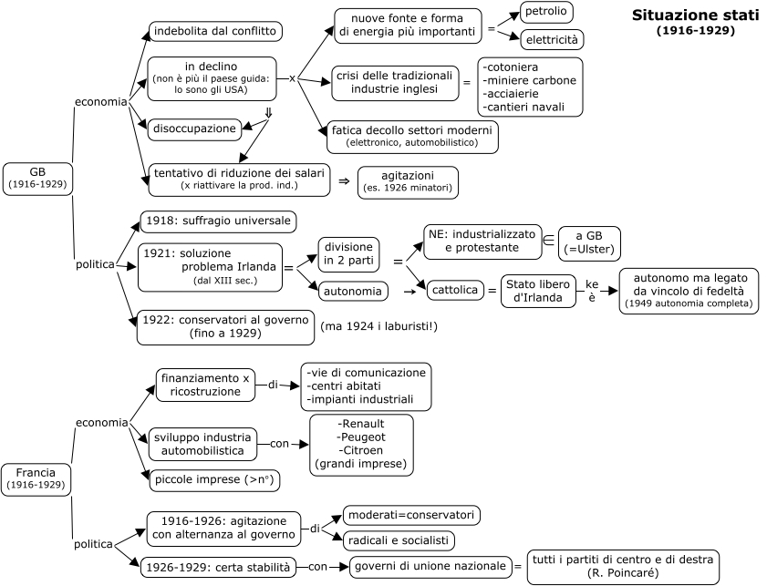 This Concept Map, created with IHMC CmapTools, has information related to: 09a_gb_fr, GB (1916-1929) politica 1922: conservatori al governo (fino a 1929), in declino (non è più il paese guida: lo sono gli USA) ⇓ tentativo di riduzione dei salari (x riattivare la prod. ind.), in declino (non è più il paese guida: lo sono gli USA) x nuove fonte e forma di energia più importanti, crisi delle tradizionali industrie inglesi = -cotoniera -miniere carbone -acciaierie -cantieri navali, GB (1916-1929) politica 1921: soluzione problema Irlanda (dal XIII sec.), 1916-1926: agitazione con alternanza al governo di radicali e socialisti, GB (1916-1929) economia in declino (non è più il paese guida: lo sono gli USA), NE: industrializzato e protestante ∈ a GB (=Ulster), GB (1916-1929) economia tentativo di riduzione dei salari (x riattivare la prod. ind.), Francia (1916-1929) economia sviluppo industria automobilistica, divisione in 2 parti = NE: industrializzato e protestante, governi di unione nazionale = tutti i partiti di centro e di destra (R. Poincaré), 1926-1929: certa stabilità con governi di unione nazionale, GB (1916-1929) economia indebolita dal conflitto, finanziamento x ricostruzione di -vie di comunicazione -centri abitati -impianti industriali, 1916-1926: agitazione con alternanza al governo di moderati=conservatori, GB (1916-1929) politica 1918: suffragio universale, in declino (non è più il paese guida: lo sono gli USA) ⇓ disoccupazione, Stato libero d'Irlanda ke è autonomo ma legato da vincolo di fedeltà (1949 autonomia completa), 1921: soluzione problema Irlanda (dal XIII sec.) = divisione in 2 parti